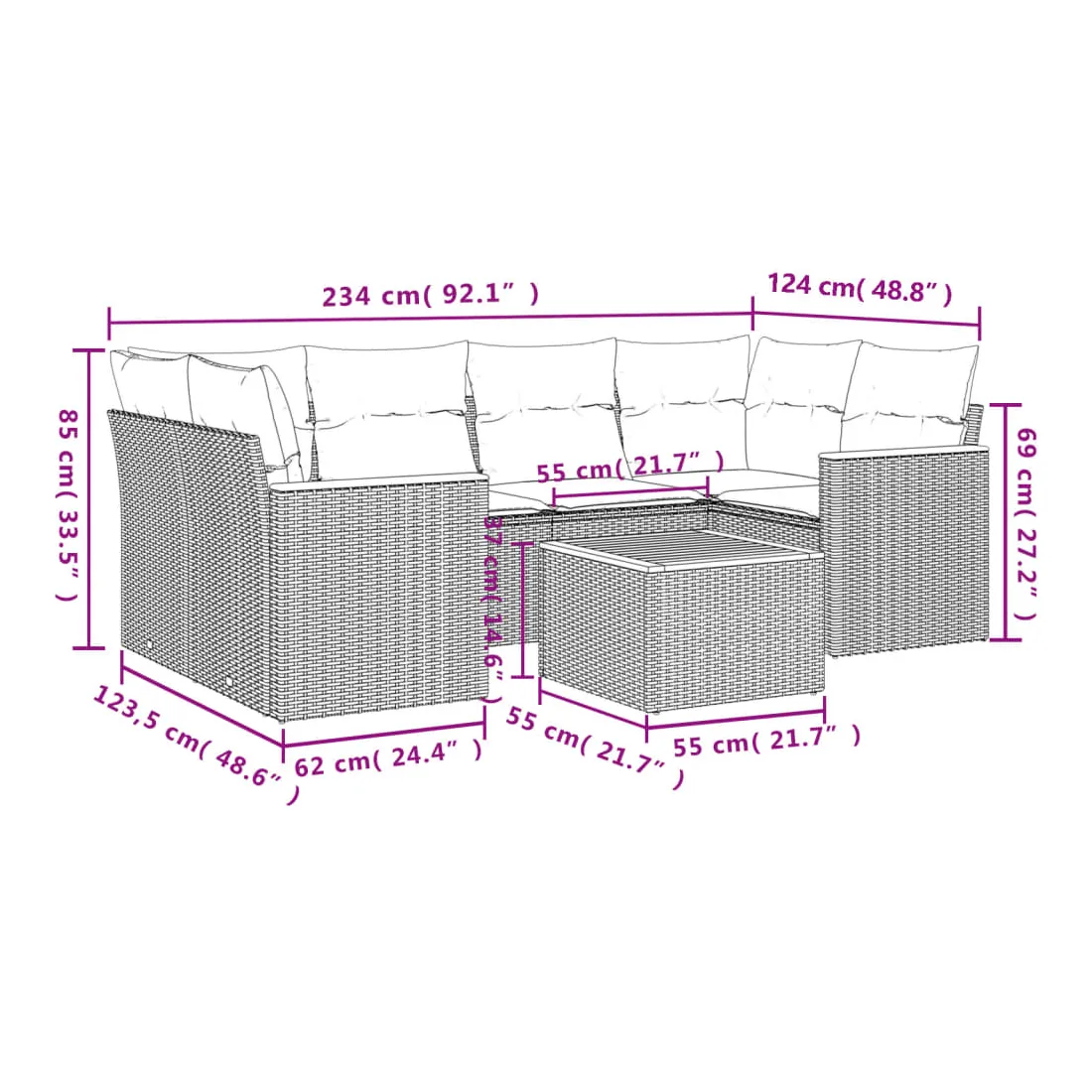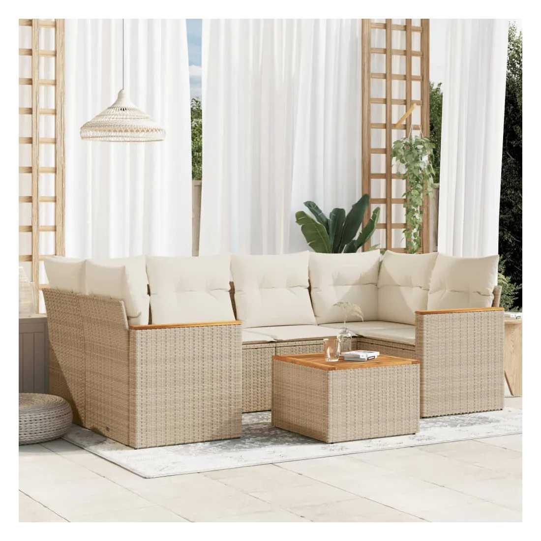 Cet ensemble de canapés de jardin est le complément parfait de votre arrière-cour, terrasse ou patio, offrant un espace confortable et accueillant pour discuter avec la famille et les amis ou simplement se détendre et profiter de l'extérieur. Matériau durable : la résine tressée, également connue sous le nom de poly rotin, est un matériau synthétique solide et nécessitant peu d'entretien qui ressemble au rotin naturel. Il est léger, facile à nettoyer et couramment utilisé pour les meubles d'extérieur en raison de sa durabilité et de ses propriétés de résistance aux intempéries.Dessus stable et facile à nettoyer : cette table de jardin a un dessus en bois d'acacia robuste, durable et facile à nettoyer avec un chiffon humide.Housse amovible et lavable : ces coussins de siège sont dotés de housses amovibles pour un lavage et un entretien faciles.Cadre robuste et stable : le cadre en acier enduit de poudre assure la solidité et la stabilité du meuble de jardin pour une utilisation quotidienne à l'extérieur.Conception modulaire : cet ensemble de meubles d'extérieur a une conception modulaire, ce qui le rend complètement flexible et facile à déplacer, afin que vous puissiez créer un agencement de meubles d'extérieur personnalisé. Bon à savoir :Pour que vos meubles d'extérieur restent beaux, nous vous recommandons de les protéger avec une housse imperméable.