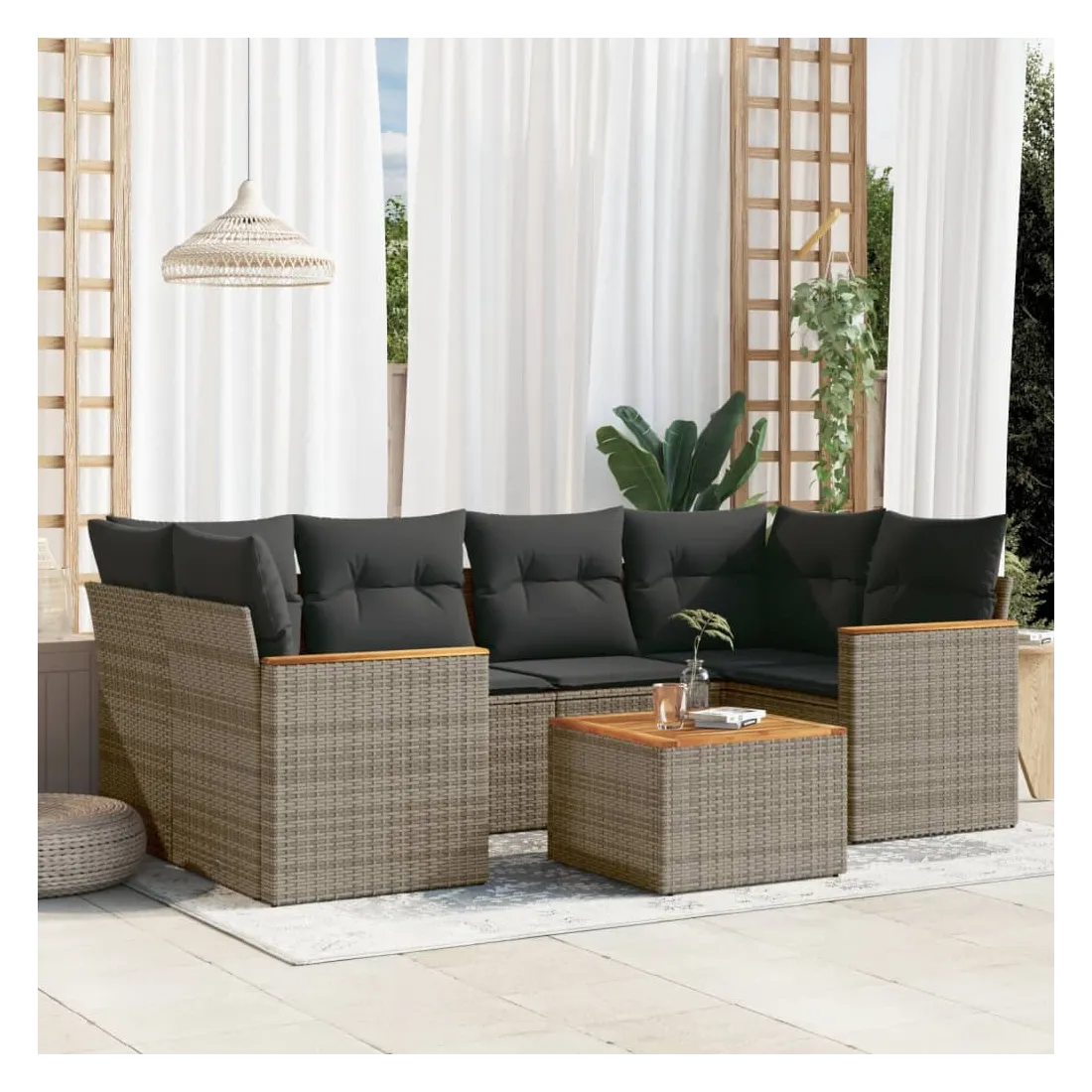 Cet ensemble de canapés de jardin est le complément parfait de votre arrière-cour, terrasse ou patio, offrant un espace confortable et accueillant pour discuter avec la famille et les amis ou simplement se détendre et profiter de l'extérieur. Matériau durable : la résine tressée, également connue sous le nom de poly rotin, est un matériau synthétique solide et nécessitant peu d'entretien qui ressemble au rotin naturel. Il est léger, facile à nettoyer et couramment utilisé pour les meubles d'extérieur en raison de sa durabilité et de ses propriétés de résistance aux intempéries.Dessus stable et facile à nettoyer : cette table de jardin a un dessus en bois d'acacia robuste, durable et facile à nettoyer avec un chiffon humide.Housse amovible et lavable : ces coussins de siège sont dotés de housses amovibles pour un lavage et un entretien faciles.Cadre robuste et stable : le cadre en acier enduit de poudre assure la solidité et la stabilité du meuble de jardin pour une utilisation quotidienne à l'extérieur.Conception modulaire : cet ensemble de meubles d'extérieur a une conception modulaire, ce qui le rend complètement flexible et facile à déplacer, afin que vous puissiez créer un agencement de meubles d'extérieur personnalisé. Bon à savoir :Pour que vos meubles d'extérieur restent beaux, nous vous recommandons de les protéger avec une housse imperméable.
