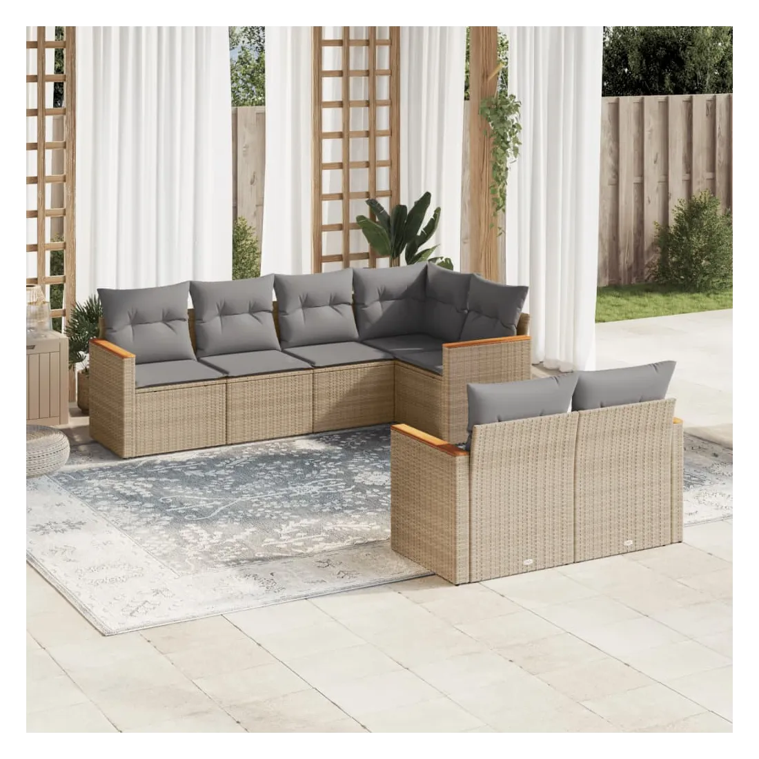 Cet ensemble de canapés de jardin est le complément parfait de votre arrière-cour, terrasse ou patio, offrant un espace confortable et accueillant pour discuter avec la famille et les amis ou simplement se détendre et profiter de l'extérieur. Matériau durable : la résine tressée, également connue sous le nom de poly rotin, est un matériau synthétique solide et nécessitant peu d'entretien qui ressemble au rotin naturel. Il est léger, facile à nettoyer et couramment utilisé pour les meubles d'extérieur en raison de sa durabilité et de ses propriétés de résistance aux intempéries.Housse amovible et lavable : ces coussins de siège sont dotés de housses amovibles pour un lavage et un entretien faciles.Cadre robuste et stable : le cadre en acier enduit de poudre assure la solidité et la stabilité du meuble de jardin pour une utilisation quotidienne à l'extérieur.Conception modulaire : cet ensemble de meubles d'extérieur a une conception modulaire, ce qui le rend complètement flexible et facile à déplacer, afin que vous puissiez créer un agencement de meubles d'extérieur personnalisé. Bon à savoir :Pour que vos meubles d'extérieur restent beaux, nous vous recommandons de les protéger avec une housse imperméable.