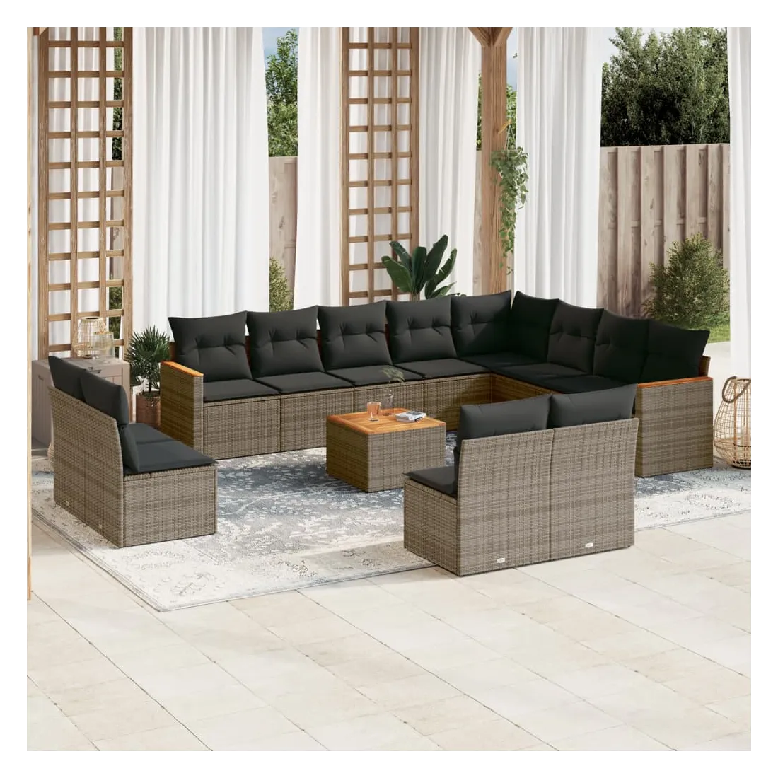 Cet ensemble de canapés de jardin est le complément parfait de votre arrière-cour, terrasse ou patio, offrant un espace confortable et accueillant pour discuter avec la famille et les amis ou simplement se détendre et profiter de l'extérieur. Matériau durable : la résine tressée, également connue sous le nom de poly rotin, est un matériau synthétique solide et nécessitant peu d'entretien qui ressemble au rotin naturel. Il est léger, facile à nettoyer et couramment utilisé pour les meubles d'extérieur en raison de sa durabilité et de ses propriétés de résistance aux intempéries.Dessus stable et facile à nettoyer : cette table de jardin a un dessus en bois d'acacia robuste, durable et facile à nettoyer avec un chiffon humide.Housse amovible et lavable : ces coussins de siège sont dotés de housses amovibles pour un lavage et un entretien faciles.Cadre robuste et stable : le cadre en acier enduit de poudre assure la solidité et la stabilité du meuble de jardin pour une utilisation quotidienne à l'extérieur.Conception modulaire : cet ensemble de meubles d'extérieur a une conception modulaire, ce qui le rend complètement flexible et facile à déplacer, afin que vous puissiez créer un agencement de meubles d'extérieur personnalisé. Bon à savoir :Pour que vos meubles d'extérieur restent beaux, nous vous recommandons de les protéger avec une housse imperméable.