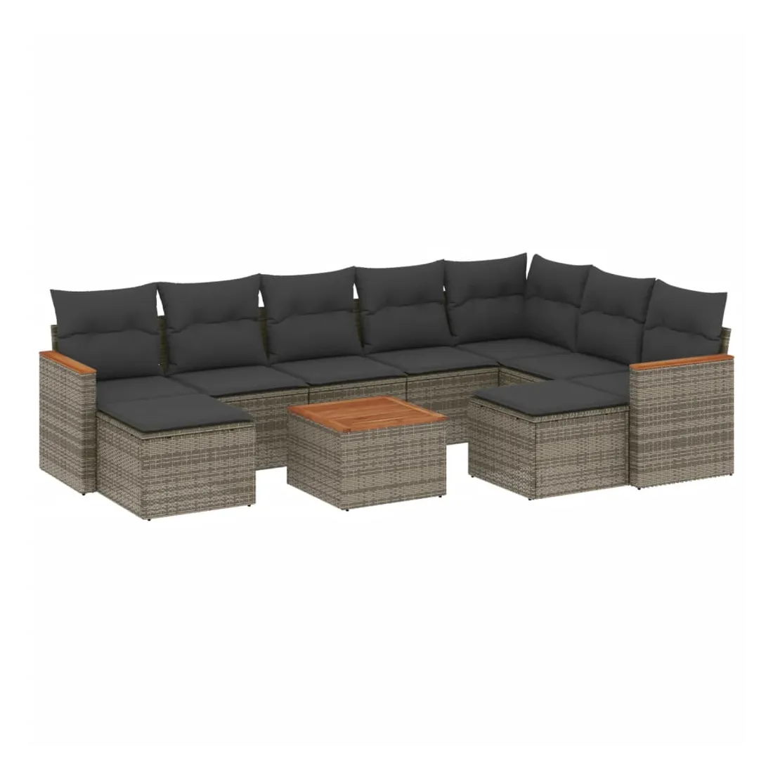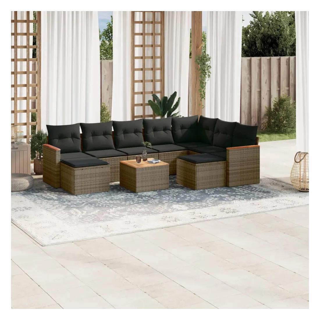 Cet ensemble de canapés de jardin est le complément parfait de votre arrière-cour, terrasse ou patio, offrant un espace confortable et accueillant pour discuter avec la famille et les amis ou simplement se détendre et profiter de l'extérieur. Matériau durable : la résine tressée, également connue sous le nom de poly rotin, est un matériau synthétique solide et nécessitant peu d'entretien qui ressemble au rotin naturel. Il est léger, facile à nettoyer et couramment utilisé pour les meubles d'extérieur en raison de sa durabilité et de ses propriétés de résistance aux intempéries.Dessus stable et facile à nettoyer : cette table de jardin a un dessus en bois d'acacia robuste, durable et facile à nettoyer avec un chiffon humide.Housse amovible et lavable : ces coussins de siège sont dotés de housses amovibles pour un lavage et un entretien faciles.Cadre robuste et stable : le cadre en acier enduit de poudre assure la solidité et la stabilité du meuble de jardin pour une utilisation quotidienne à l'extérieur.Conception modulaire : cet ensemble de meubles d'extérieur a une conception modulaire, ce qui le rend complètement flexible et facile à déplacer, afin que vous puissiez créer un agencement de meubles d'extérieur personnalisé. Bon à savoir :Pour que vos meubles d'extérieur restent beaux, nous vous recommandons de les protéger avec une housse imperméable.