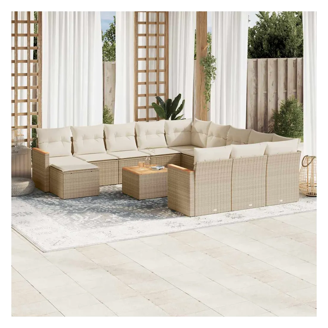 Cet ensemble de canapés de jardin est le complément parfait de votre arrière-cour, terrasse ou patio, offrant un espace confortable et accueillant pour discuter avec la famille et les amis ou simplement se détendre et profiter de l'extérieur. Matériau durable : la résine tressée, également connue sous le nom de poly rotin, est un matériau synthétique solide et nécessitant peu d'entretien qui ressemble au rotin naturel. Il est léger, facile à nettoyer et couramment utilisé pour les meubles d'extérieur en raison de sa durabilité et de ses propriétés de résistance aux intempéries.Dessus stable et facile à nettoyer : cette table de jardin a un dessus en bois d'acacia robuste, durable et facile à nettoyer avec un chiffon humide.Housse amovible et lavable : ces coussins de siège sont dotés de housses amovibles pour un lavage et un entretien faciles.Cadre robuste et stable : le cadre en acier enduit de poudre assure la solidité et la stabilité du meuble de jardin pour une utilisation quotidienne à l'extérieur.Conception modulaire : cet ensemble de meubles d'extérieur a une conception modulaire, ce qui le rend complètement flexible et facile à déplacer, afin que vous puissiez créer un agencement de meubles d'extérieur personnalisé. Bon à savoir :Pour que vos meubles d'extérieur restent beaux, nous vous recommandons de les protéger avec une housse imperméable.