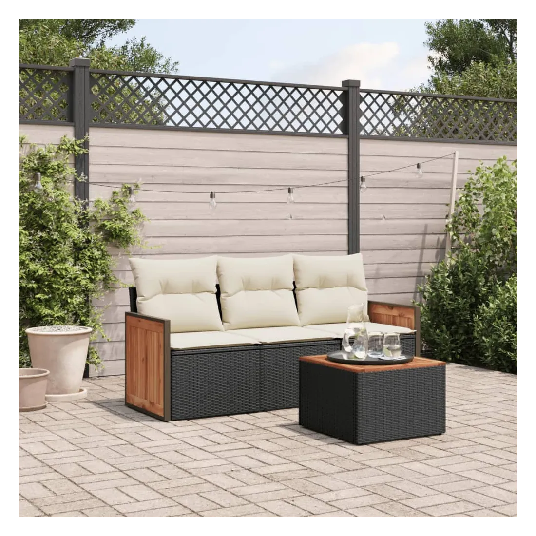 Cet ensemble de canapés de jardin est le complément parfait de votre arrière-cour, terrasse ou patio, offrant un espace confortable et accueillant pour discuter avec la famille et les amis ou simplement se détendre et profiter de l'extérieur. Matériau durable : la résine tressée, également connue sous le nom de poly rotin, est un matériau synthétique solide et nécessitant peu d'entretien qui ressemble au rotin naturel. Il est léger, facile à nettoyer et couramment utilisé pour les meubles d'extérieur en raison de sa durabilité et de ses propriétés de résistance aux intempéries.Expérience d'assise confortable : ce mobilier d'extérieur, doté de coussins épais, offre une expérience d'assise confortable.Dessus stable et facile à nettoyer : cette table de jardin a un dessus en bois d'acacia robuste, durable et facile à nettoyer avec un chiffon humide.Housse amovible et lavable : ces coussins de siège sont dotés de housses amovibles pour un lavage et un entretien faciles.Conception modulaire : cet ensemble de meubles d'extérieur a une conception modulaire, ce qui le rend complètement flexible et facile à déplacer, afin que vous puissiez créer un agencement de meubles d'extérieur personnalisé. Bon à savoir :Pour que vos meubles d'extérieur restent beaux, nous vous recommandons de les protéger avec une housse imperméable.