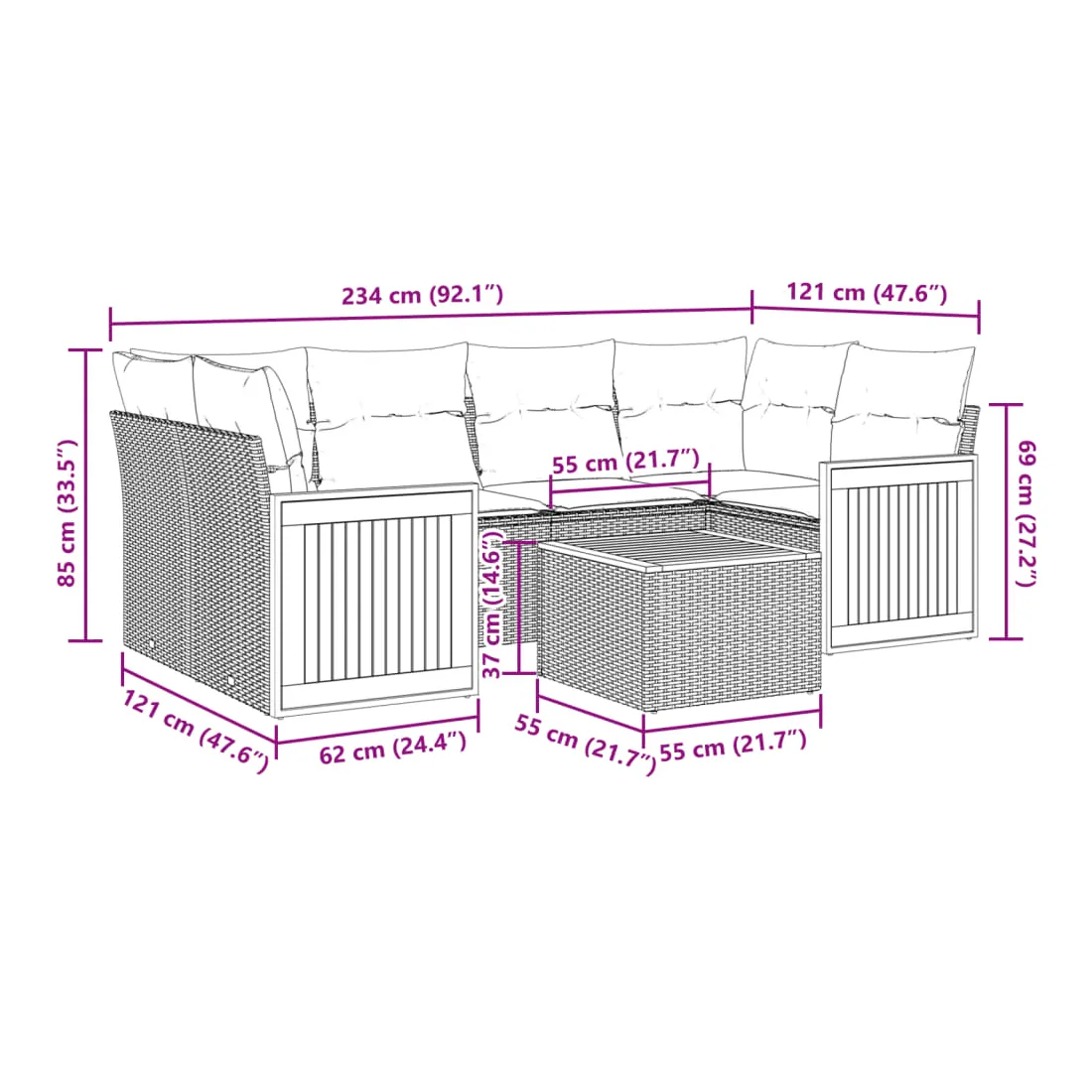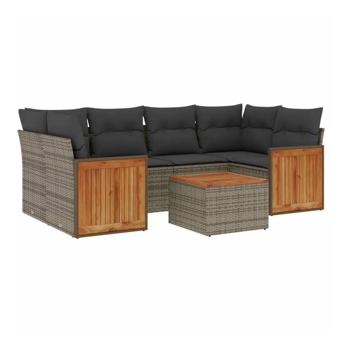 Cet ensemble de canapés de jardin est le complément parfait de votre arrière-cour, terrasse ou patio, offrant un espace confortable et accueillant pour discuter avec la famille et les amis ou simplement se détendre et profiter de l'extérieur. Matériau durable : la résine tressée, également connue sous le nom de poly rotin, est un matériau synthétique solide et nécessitant peu d'entretien qui ressemble au rotin naturel. Il est léger, facile à nettoyer et couramment utilisé pour les meubles d'extérieur en raison de sa durabilité et de ses propriétés de résistance aux intempéries.Expérience d'assise confortable : ce mobilier d'extérieur, doté de coussins épais, offre une expérience d'assise confortable.Dessus stable et facile à nettoyer : cette table de jardin a un dessus en bois d'acacia robuste, durable et facile à nettoyer avec un chiffon humide.Housse amovible et lavable : ces coussins de siège sont dotés de housses amovibles pour un lavage et un entretien faciles.Conception modulaire : cet ensemble de meubles d'extérieur a une conception modulaire, ce qui le rend complètement flexible et facile à déplacer, afin que vous puissiez créer un agencement de meubles d'extérieur personnalisé. Bon à savoir :Pour que vos meubles d'extérieur restent beaux, nous vous recommandons de les protéger avec une housse imperméable.