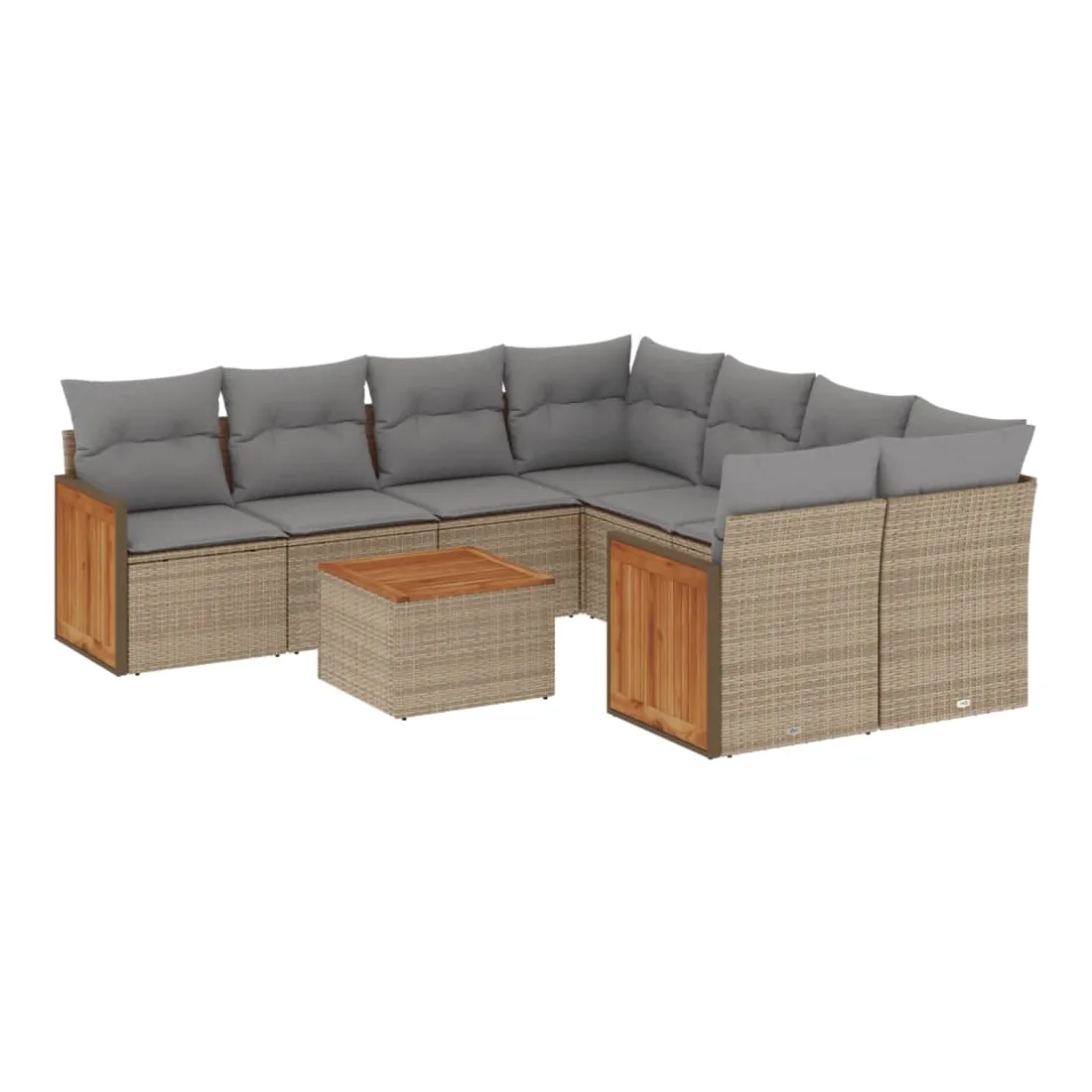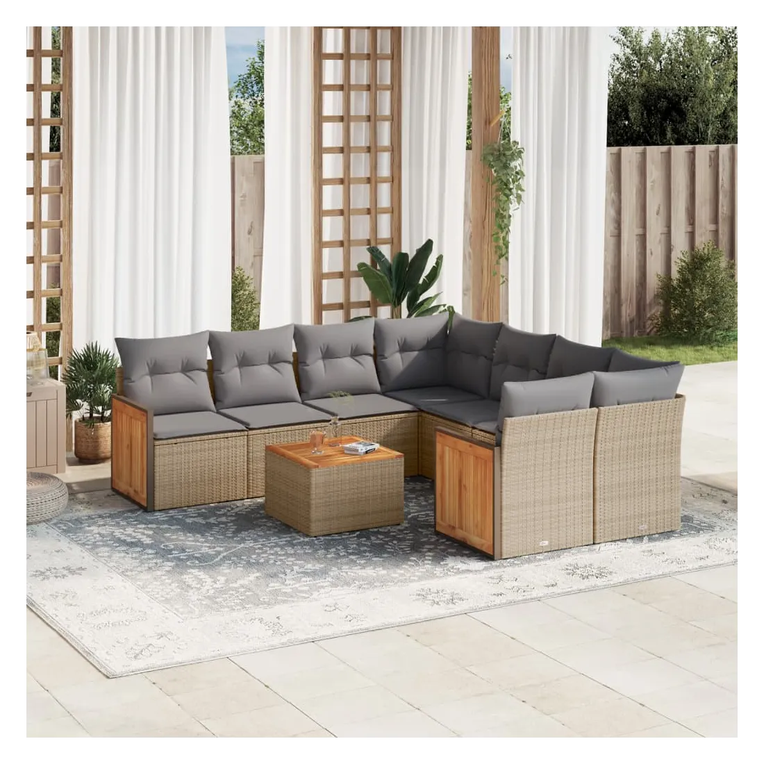 Cet ensemble de canapés de jardin est le complément parfait de votre arrière-cour, terrasse ou patio, offrant un espace confortable et accueillant pour discuter avec la famille et les amis ou simplement se détendre et profiter de l'extérieur. Matériau durable : la résine tressée, également connue sous le nom de poly rotin, est un matériau synthétique solide et nécessitant peu d'entretien qui ressemble au rotin naturel. Il est léger, facile à nettoyer et couramment utilisé pour les meubles d'extérieur en raison de sa durabilité et de ses propriétés de résistance aux intempéries.Expérience d'assise confortable : ce mobilier d'extérieur, doté de coussins épais, offre une expérience d'assise confortable.Dessus stable et facile à nettoyer : cette table de jardin a un dessus en bois d'acacia robuste, durable et facile à nettoyer avec un chiffon humide.Housse amovible et lavable : ces coussins de siège sont dotés de housses amovibles pour un lavage et un entretien faciles.Conception modulaire : cet ensemble de meubles d'extérieur a une conception modulaire, ce qui le rend complètement flexible et facile à déplacer, afin que vous puissiez créer un agencement de meubles d'extérieur personnalisé. Bon à savoir :Pour que vos meubles d'extérieur restent beaux, nous vous recommandons de les protéger avec une housse imperméable.