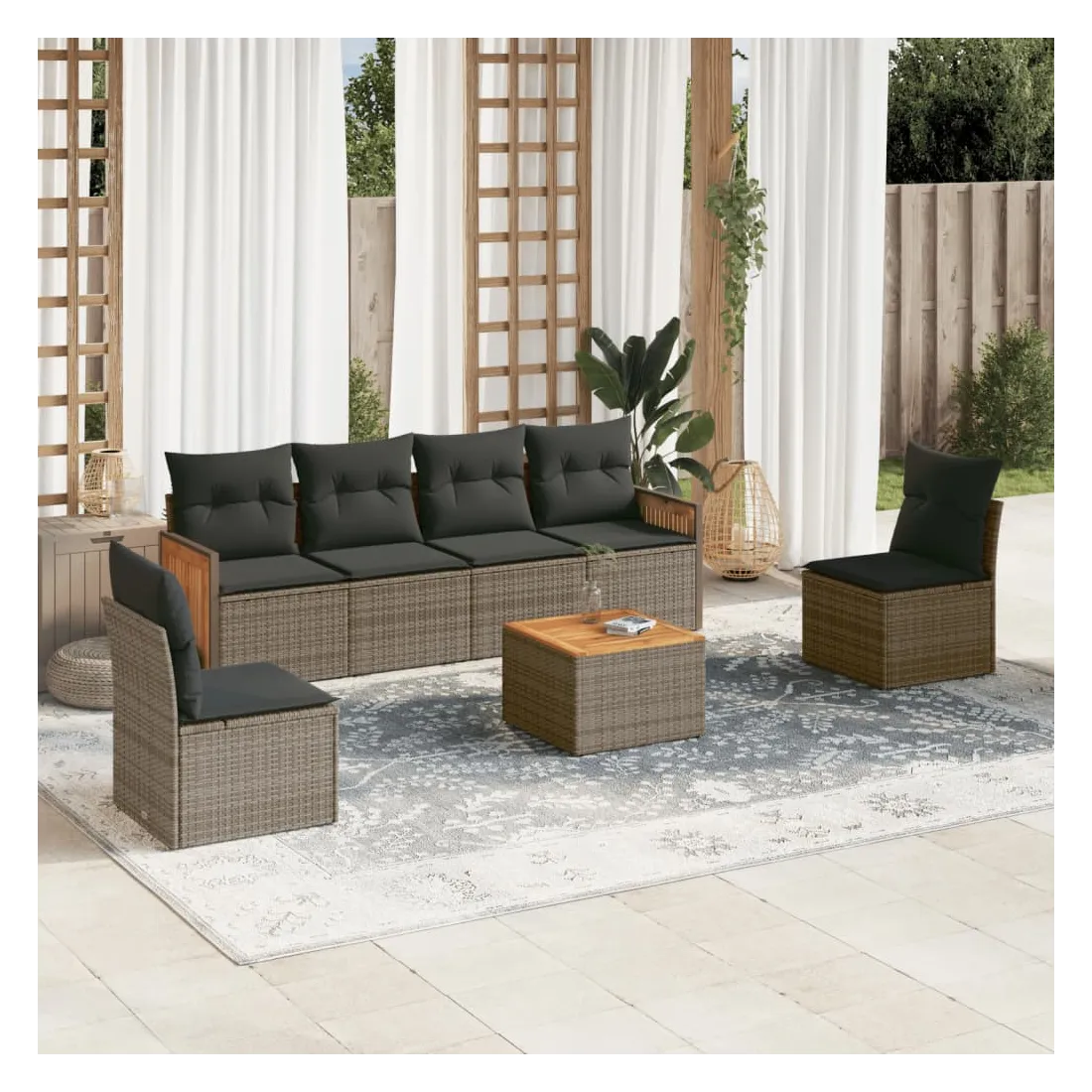 Cet ensemble de canapés de jardin est le complément parfait de votre arrière-cour, terrasse ou patio, offrant un espace confortable et accueillant pour discuter avec la famille et les amis ou simplement se détendre et profiter de l'extérieur. Matériau durable : la résine tressée, également connue sous le nom de poly rotin, est un matériau synthétique solide et nécessitant peu d'entretien qui ressemble au rotin naturel. Il est léger, facile à nettoyer et couramment utilisé pour les meubles d'extérieur en raison de sa durabilité et de ses propriétés de résistance aux intempéries.Expérience d'assise confortable : ce mobilier d'extérieur, doté de coussins épais, offre une expérience d'assise confortable.Dessus stable et facile à nettoyer : cette table de jardin a un dessus en bois d'acacia robuste, durable et facile à nettoyer avec un chiffon humide.Housse amovible et lavable : ces coussins de siège sont dotés de housses amovibles pour un lavage et un entretien faciles.Conception modulaire : cet ensemble de meubles d'extérieur a une conception modulaire, ce qui le rend complètement flexible et facile à déplacer, afin que vous puissiez créer un agencement de meubles d'extérieur personnalisé. Bon à savoir :Pour que vos meubles d'extérieur restent beaux, nous vous recommandons de les protéger avec une housse imperméable.