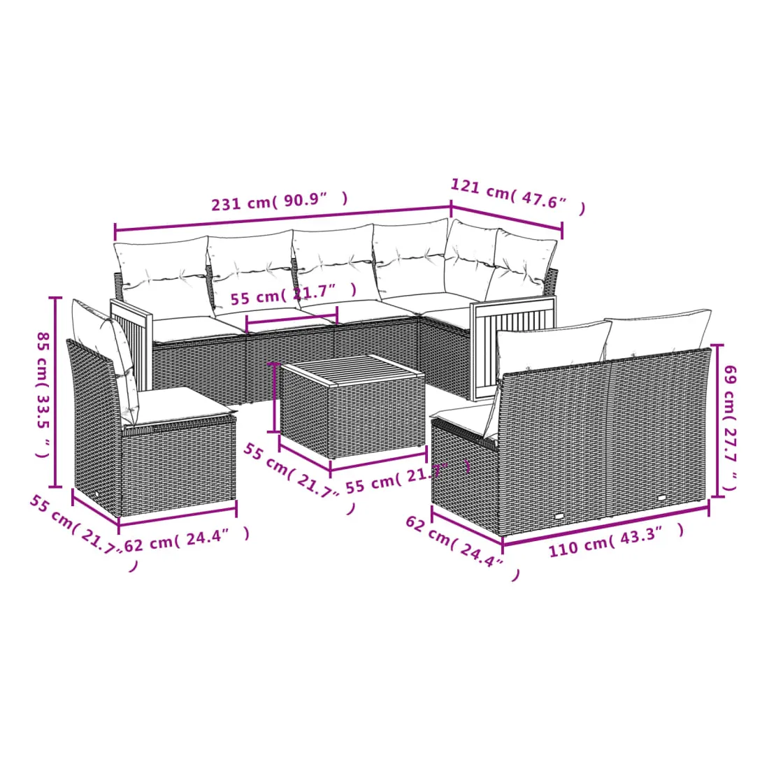 - 8 x coussin d'assise avec housse amovible et lavable