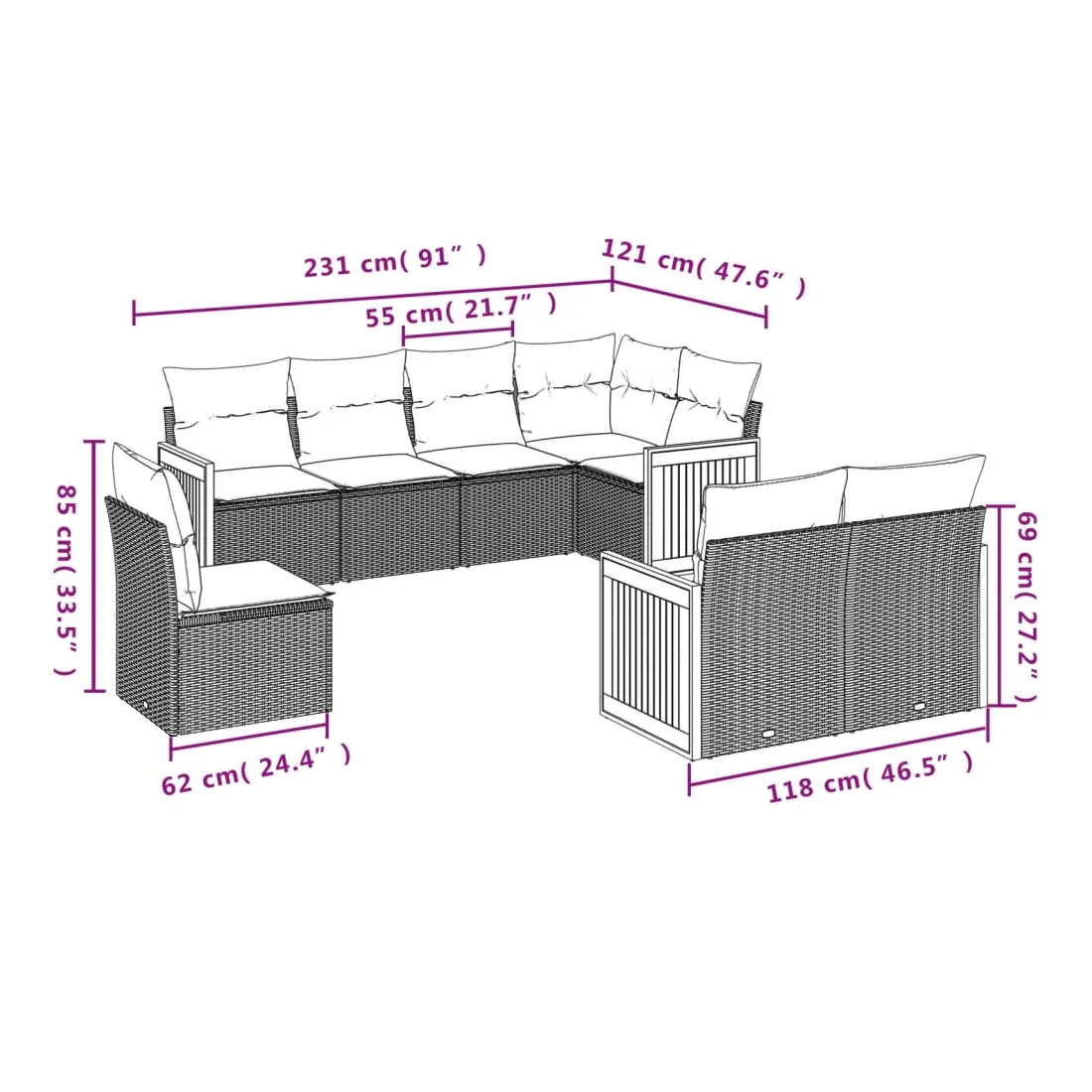 Cet ensemble de canapés de jardin est le complément parfait de votre arrière-cour, terrasse ou patio, offrant un espace confortable et accueillant pour discuter avec la famille et les amis ou simplement se détendre et profiter de l'extérieur. Matériau durable : la résine tressée, également connue sous le nom de poly rotin, est un matériau synthétique solide et nécessitant peu d'entretien qui ressemble au rotin naturel. Il est léger, facile à nettoyer et couramment utilisé pour les meubles d'extérieur en raison de sa durabilité et de ses propriétés de résistance aux intempéries.Expérience d'assise confortable : ce mobilier d'extérieur, doté de coussins épais, offre une expérience d'assise confortable.Housse amovible et lavable : ces coussins de siège sont dotés de housses amovibles pour un lavage et un entretien faciles.Conception modulaire : cet ensemble de meubles d'extérieur a une conception modulaire, ce qui le rend complètement flexible et facile à déplacer, afin que vous puissiez créer un agencement de meubles d'extérieur personnalisé. Bon à savoir :Pour que vos meubles d'extérieur restent beaux, nous vous recommandons de les protéger avec une housse imperméable.