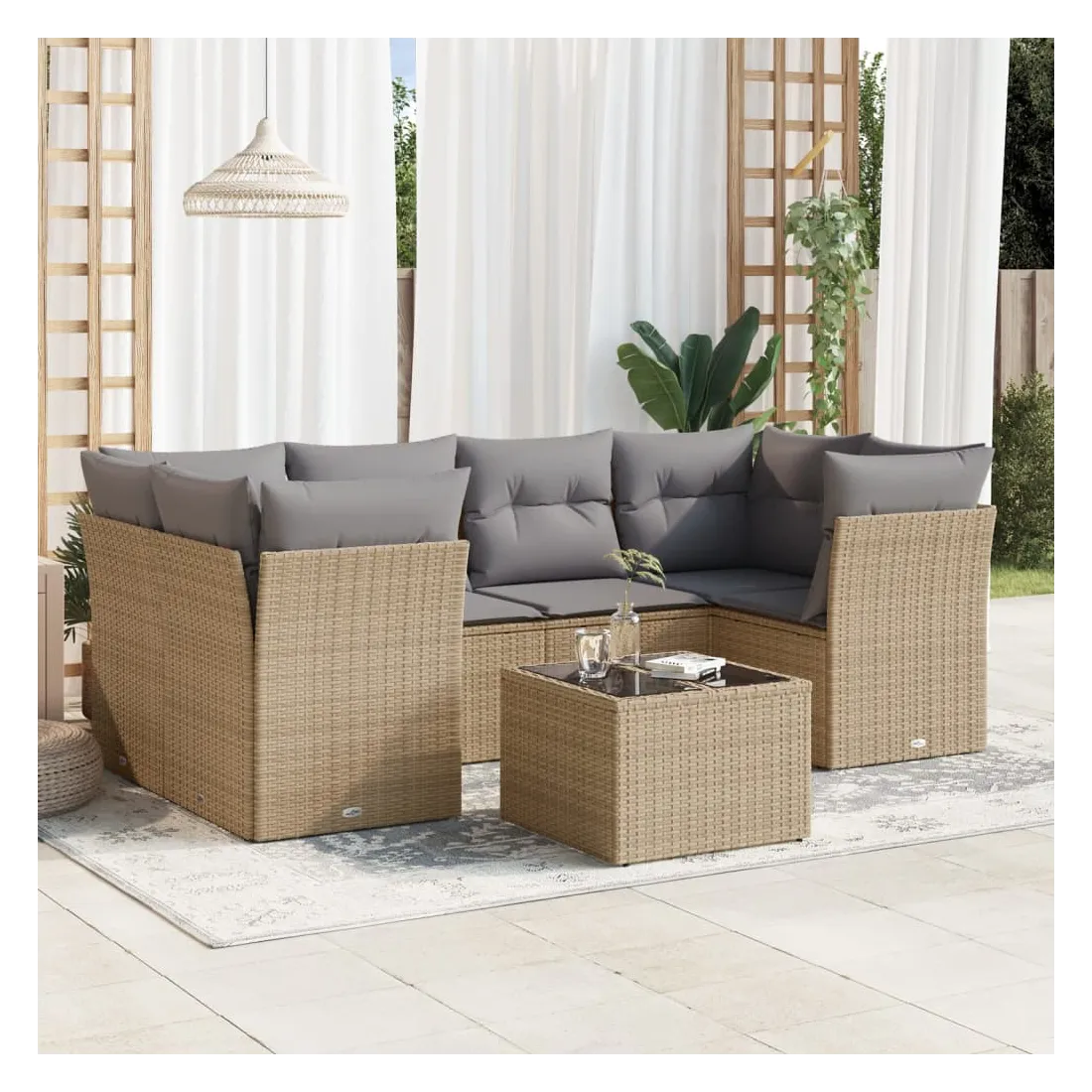 Cet ensemble de canapés de jardin est le complément parfait de votre arrière-cour, terrasse ou patio, offrant un espace confortable et accueillant pour discuter avec la famille et les amis ou simplement se détendre et profiter de l'extérieur. Matériau durable : la résine tressée, également connue sous le nom de poly rotin, est un matériau synthétique solide et nécessitant peu d'entretien qui ressemble au rotin naturel. Il est léger, facile à nettoyer et couramment utilisé pour les meubles d'extérieur en raison de sa durabilité et de ses propriétés de résistance aux intempéries.Fonction de rangement avec sac résistant à l'eau : chaque siège de jardin dispose d'un espace de rangement sous l'assise, complété par un sac résistant à l'eau pour ranger les coussins, les jouets et d'autres objets. Les sacs intérieurs sont dotés d'un couvercle et peuvent être solidement fixés aux sièges à l'aide de bandes auto-agrippantes pour plus de stabilité.Dessus en verre : le dessus de la table d'extérieur est fabriqué en verre trempé solide et durable, ce qui le rend facile à nettoyer avec un chiffon humide et ajoute une touche d'élégance à votre espace extérieur.Housse amovible et lavable : ces coussins de siège sont dotés de housses amovibles pour un lavage et un entretien faciles.Conception modulaire : cet ensemble de meubles d'extérieur a une conception modulaire, ce qui le rend complètement flexible et facile à déplacer, afin que vous puissiez créer un agencement de meubles d'extérieur personnalisé. Bon à savoir :Pour que vos meubles d'extérieur restent beaux, nous vous recommandons de les protéger avec une housse imperméable.