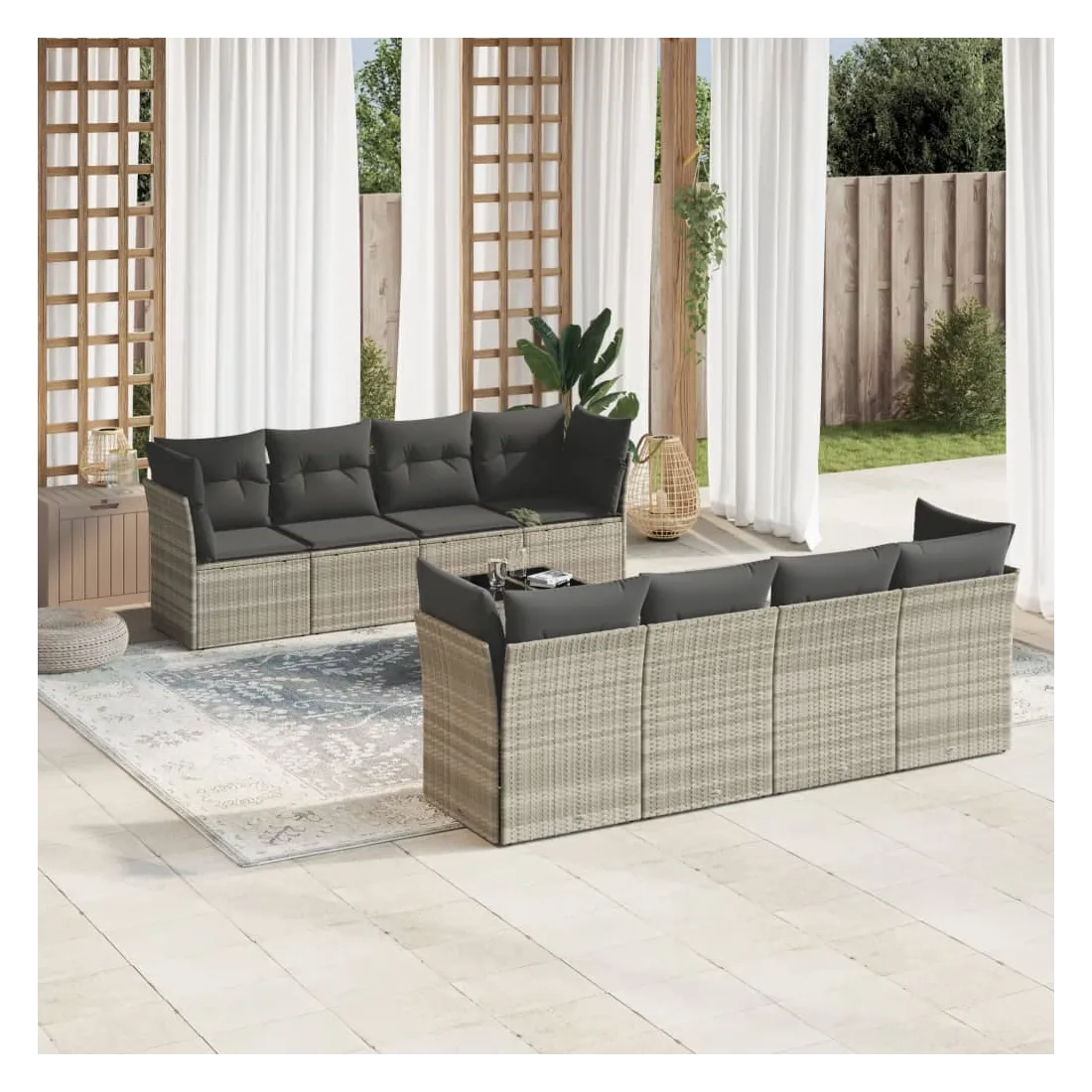 Cet ensemble de canapés de jardin est le complément parfait de votre arrière-cour, terrasse ou patio, offrant un espace confortable et accueillant pour discuter avec la famille et les amis ou simplement se détendre et profiter de l'extérieur. Matériau durable : la résine tressée, également connue sous le nom de poly rotin, est un matériau synthétique solide et nécessitant peu d'entretien qui ressemble au rotin naturel. Il est léger, facile à nettoyer et couramment utilisé pour les meubles d'extérieur en raison de sa durabilité et de ses propriétés de résistance aux intempéries.Fonction de rangement avec sac résistant à l'eau : chaque siège de jardin dispose d'un espace de rangement sous l'assise, complété par un sac résistant à l'eau pour ranger les coussins, les jouets et d'autres objets. Les sacs intérieurs sont dotés d'un couvercle et peuvent être solidement fixés aux sièges à l'aide de bandes auto-agrippantes pour plus de stabilité.Dessus en verre : le dessus de la table d'extérieur est fabriqué en verre trempé solide et durable, ce qui le rend facile à nettoyer avec un chiffon humide et ajoute une touche d'élégance à votre espace extérieur.Housse amovible et lavable : ces coussins de siège sont dotés de housses amovibles pour un lavage et un entretien faciles.Conception modulaire : cet ensemble de meubles d'extérieur a une conception modulaire, ce qui le rend complètement flexible et facile à déplacer, afin que vous puissiez créer un agencement de meubles d'extérieur personnalisé. Bon à savoir :Pour que vos meubles d'extérieur restent beaux, nous vous recommandons de les protéger avec une housse imperméable.
