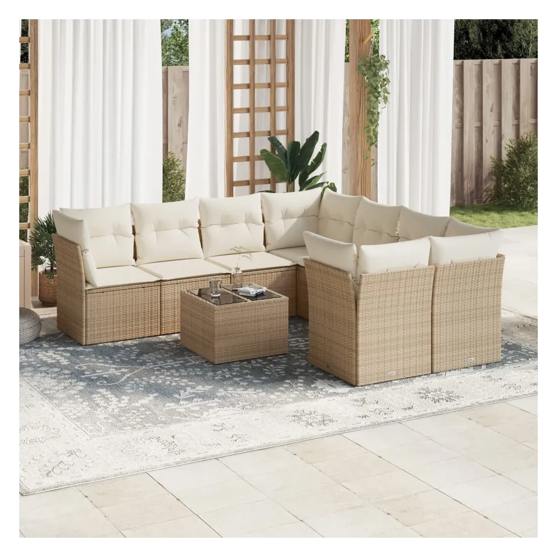 Cet ensemble de canapés de jardin est le complément parfait de votre arrière-cour, terrasse ou patio, offrant un espace confortable et accueillant pour discuter avec la famille et les amis ou simplement se détendre et profiter de l'extérieur. Matériau durable : la résine tressée, également connue sous le nom de poly rotin, est un matériau synthétique solide et nécessitant peu d'entretien qui ressemble au rotin naturel. Il est léger, facile à nettoyer et couramment utilisé pour les meubles d'extérieur en raison de sa durabilité et de ses propriétés de résistance aux intempéries.Fonction de rangement avec sac résistant à l'eau : chaque siège de jardin dispose d'un espace de rangement sous l'assise, complété par un sac résistant à l'eau pour ranger les coussins, les jouets et d'autres objets. Les sacs intérieurs sont dotés d'un couvercle et peuvent être solidement fixés aux sièges à l'aide de bandes auto-agrippantes pour plus de stabilité.Dessus en verre : le dessus de la table d'extérieur est fabriqué en verre trempé solide et durable, ce qui le rend facile à nettoyer avec un chiffon humide et ajoute une touche d'élégance à votre espace extérieur.Housse amovible et lavable : ces coussins de siège sont dotés de housses amovibles pour un lavage et un entretien faciles.Conception modulaire : cet ensemble de meubles d'extérieur a une conception modulaire, ce qui le rend complètement flexible et facile à déplacer, afin que vous puissiez créer un agencement de meubles d'extérieur personnalisé. Bon à savoir :Pour que vos meubles d'extérieur restent beaux, nous vous recommandons de les protéger avec une housse imperméable.