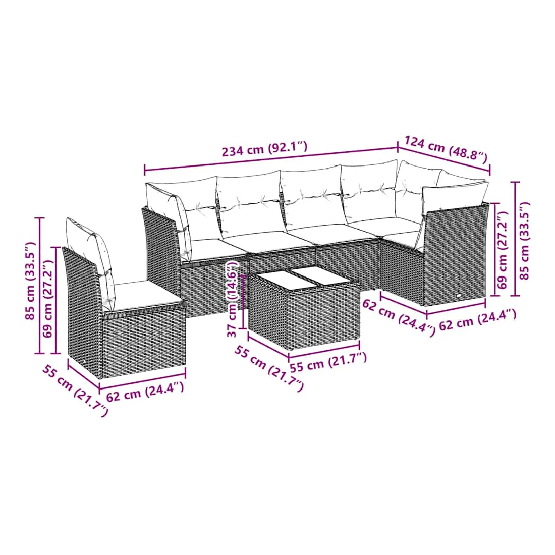 - Dimensions totales du canapé 5 places : 234 x 124 x 69 cm (l x P x H)
