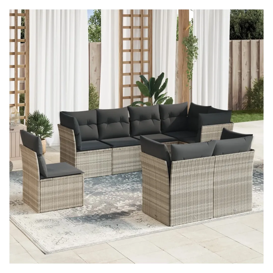 Cet ensemble de canapés de jardin est le complément parfait de votre arrière-cour, terrasse ou patio, offrant un espace confortable et accueillant pour discuter avec la famille et les amis ou simplement se détendre et profiter de l'extérieur. Matériau durable : la résine tressée, également connue sous le nom de poly rotin, est un matériau synthétique solide et nécessitant peu d'entretien qui ressemble au rotin naturel. Il est léger, facile à nettoyer et couramment utilisé pour les meubles d'extérieur en raison de sa durabilité et de ses propriétés de résistance aux intempéries.Fonction de rangement avec sac résistant à l'eau : chaque siège de jardin dispose d'un espace de rangement sous l'assise, complété par un sac résistant à l'eau pour ranger les coussins, les jouets et d'autres objets. Les sacs intérieurs sont dotés d'un couvercle et peuvent être solidement fixés aux sièges à l'aide de bandes auto-agrippantes pour plus de stabilité.Housse amovible et lavable : ces coussins de siège sont dotés de housses amovibles pour un lavage et un entretien faciles.Conception modulaire : cet ensemble de meubles d'extérieur a une conception modulaire, ce qui le rend complètement flexible et facile à déplacer, afin que vous puissiez créer un agencement de meubles d'extérieur personnalisé. Bon à savoir :Pour que vos meubles d'extérieur restent beaux, nous vous recommandons de les protéger avec une housse imperméable.
