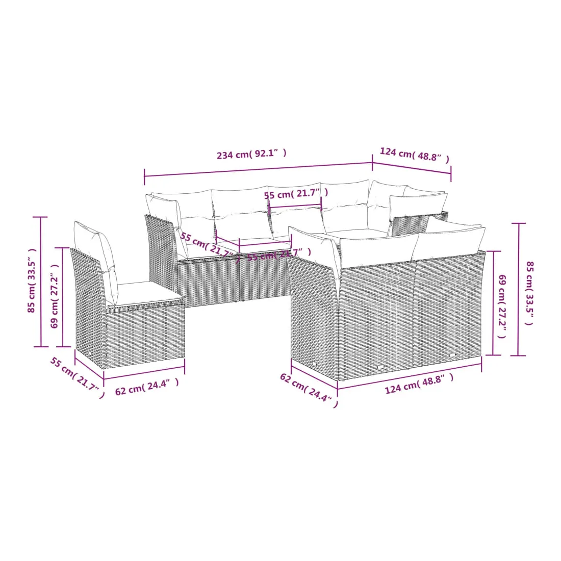 - Dimensions totales du canapé 5 places : 234 x 124 x 69 cm (l x P x H)