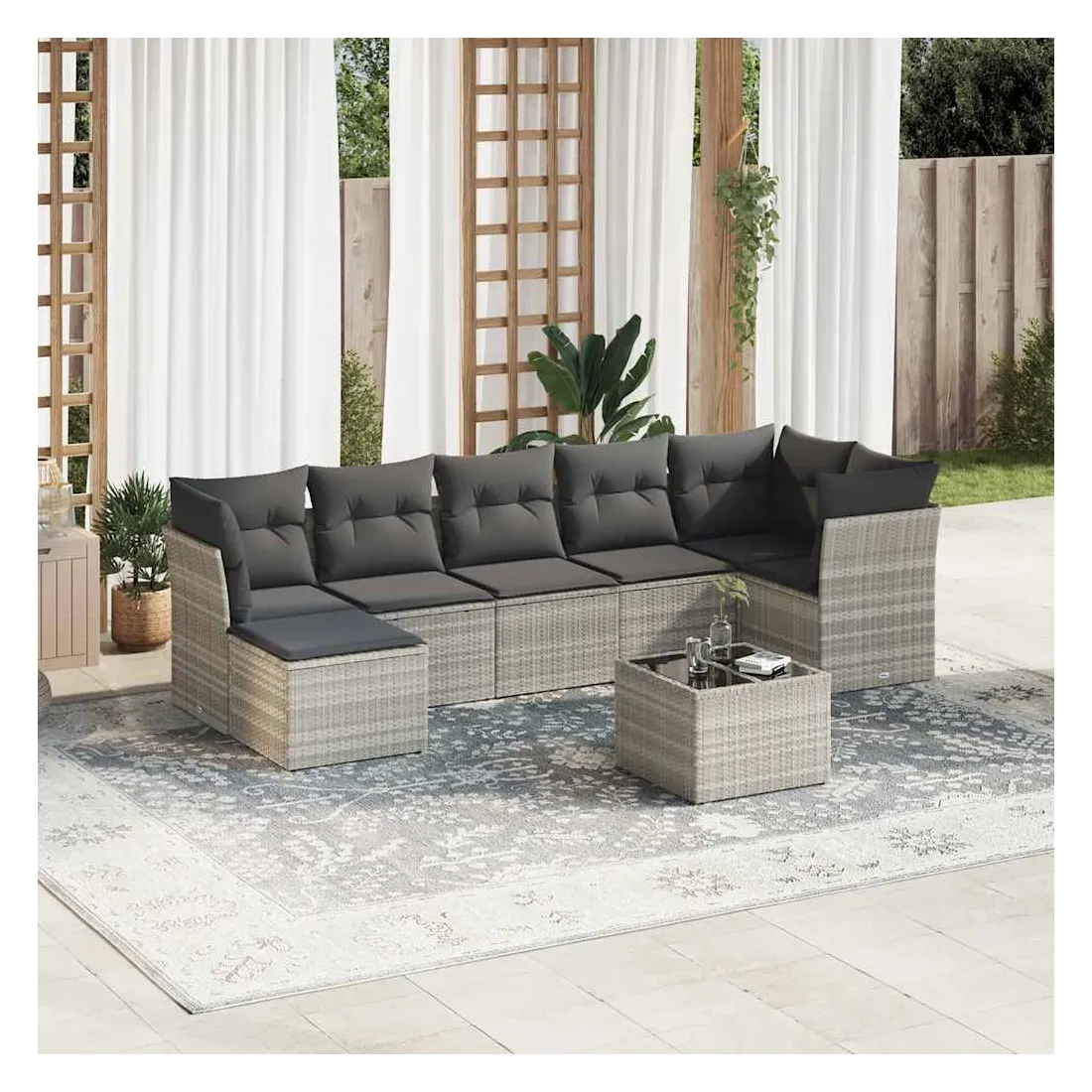 Cet ensemble de canapés de jardin est le complément parfait de votre arrière-cour, terrasse ou patio, offrant un espace confortable et accueillant pour discuter avec la famille et les amis ou simplement se détendre et profiter de l'extérieur. Matériau durable : la résine tressée, également connue sous le nom de poly rotin, est un matériau synthétique solide et nécessitant peu d'entretien qui ressemble au rotin naturel. Il est léger, facile à nettoyer et couramment utilisé pour les meubles d'extérieur en raison de sa durabilité et de ses propriétés de résistance aux intempéries.Fonction de rangement avec sac résistant à l'eau : chaque siège de jardin dispose d'un espace de rangement sous l'assise, complété par un sac résistant à l'eau pour ranger les coussins, les jouets et d'autres objets. Les sacs intérieurs sont dotés d'un couvercle et peuvent être solidement fixés aux sièges à l'aide de bandes auto-agrippantes pour plus de stabilité.Dessus en verre : le dessus de la table d'extérieur est fabriqué en verre trempé solide et durable, ce qui le rend facile à nettoyer avec un chiffon humide et ajoute une touche d'élégance à votre espace extérieur.Housse amovible et lavable : ces coussins de siège sont dotés de housses amovibles pour un lavage et un entretien faciles.Conception modulaire : cet ensemble de meubles d'extérieur a une conception modulaire, ce qui le rend complètement flexible et facile à déplacer, afin que vous puissiez créer un agencement de meubles d'extérieur personnalisé. Bon à savoir :Pour que vos meubles d'extérieur restent beaux, nous vous recommandons de les protéger avec une housse imperméable.