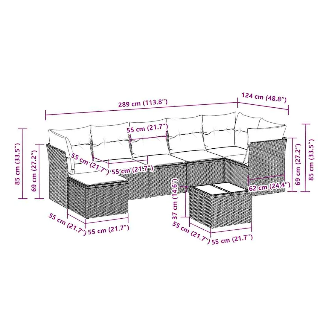 - Dimensions totales du canapé : 289 x 124 x 69 cm (l x P x H)