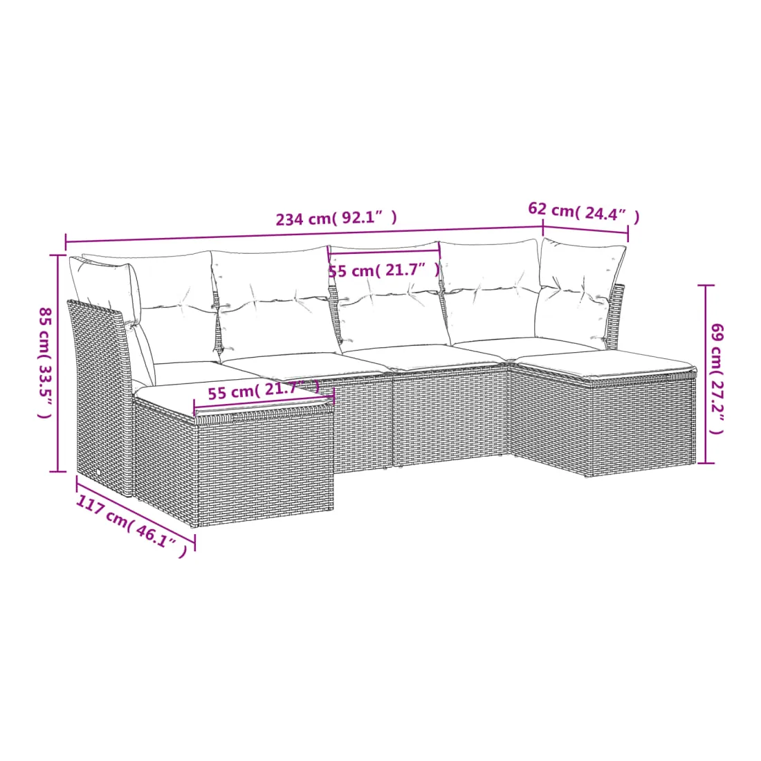 - Dimensions totales du canapé : 234 x 117 x 69 cm (l x P x H)