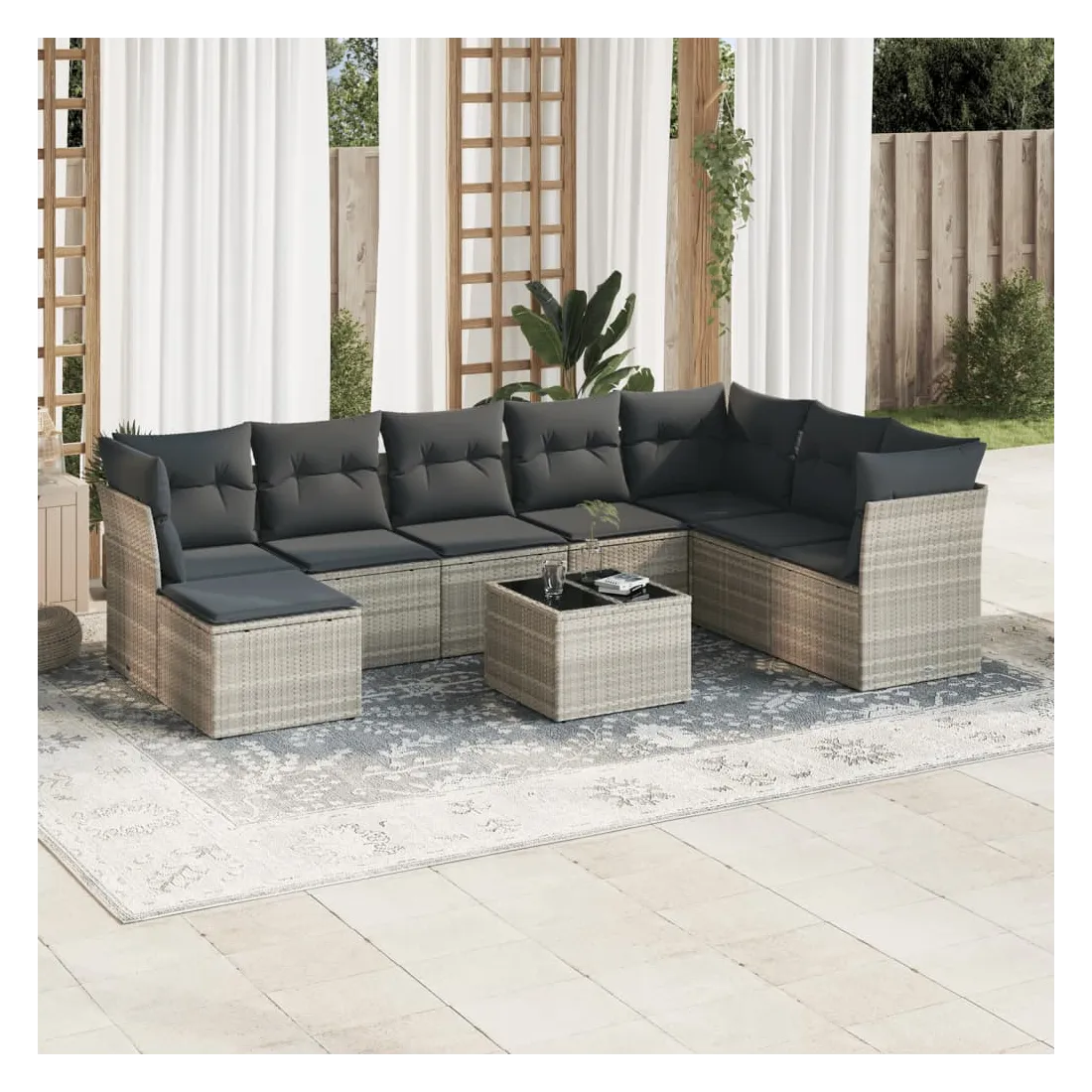 Cet ensemble de canapés de jardin est le complément parfait de votre arrière-cour, terrasse ou patio, offrant un espace confortable et accueillant pour discuter avec la famille et les amis ou simplement se détendre et profiter de l'extérieur. Matériau durable : la résine tressée, également connue sous le nom de poly rotin, est un matériau synthétique solide et nécessitant peu d'entretien qui ressemble au rotin naturel. Il est léger, facile à nettoyer et couramment utilisé pour les meubles d'extérieur en raison de sa durabilité et de ses propriétés de résistance aux intempéries.Fonction de rangement avec sac résistant à l'eau : chaque siège de jardin dispose d'un espace de rangement sous l'assise, complété par un sac résistant à l'eau pour ranger les coussins, les jouets et d'autres objets. Les sacs intérieurs sont dotés d'un couvercle et peuvent être solidement fixés aux sièges à l'aide de bandes auto-agrippantes pour plus de stabilité.Dessus en verre : le dessus de la table d'extérieur est fabriqué en verre trempé solide et durable, ce qui le rend facile à nettoyer avec un chiffon humide et ajoute une touche d'élégance à votre espace extérieur.Housse amovible et lavable : ces coussins de siège sont dotés de housses amovibles pour un lavage et un entretien faciles.Conception modulaire : cet ensemble de meubles d'extérieur a une conception modulaire, ce qui le rend complètement flexible et facile à déplacer, afin que vous puissiez créer un agencement de meubles d'extérieur personnalisé. Bon à savoir :Pour que vos meubles d'extérieur restent beaux, nous vous recommandons de les protéger avec une housse imperméable.
