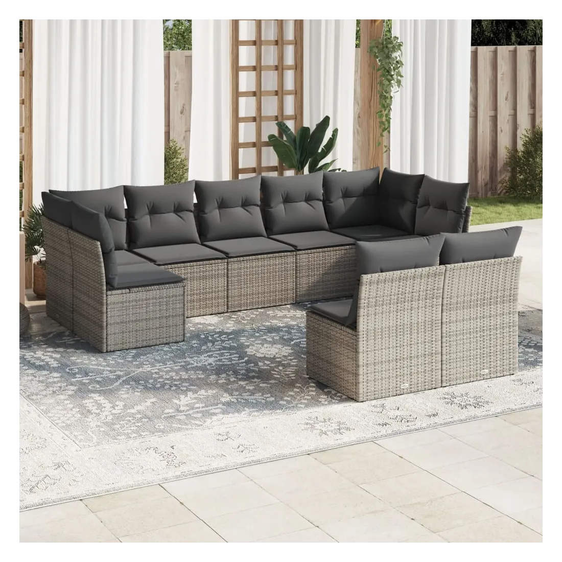 Cet ensemble de canapés de jardin est le complément parfait de votre arrière-cour, terrasse ou patio, offrant un espace confortable et accueillant pour discuter avec la famille et les amis ou simplement se détendre et profiter de l'extérieur. Matériau durable : la résine tressée, également connue sous le nom de poly rotin, est un matériau synthétique solide et nécessitant peu d'entretien qui ressemble au rotin naturel. Il est léger, facile à nettoyer et couramment utilisé pour les meubles d'extérieur en raison de sa durabilité et de ses propriétés de résistance aux intempéries.Fonction de rangement avec sac résistant à l'eau : chaque siège de jardin dispose d'un espace de rangement sous l'assise, complété par un sac résistant à l'eau pour ranger les coussins, les jouets et d'autres objets. Les sacs intérieurs sont dotés d'un couvercle et peuvent être solidement fixés aux sièges à l'aide de bandes auto-agrippantes pour plus de stabilité.Housse amovible et lavable : ces coussins de siège sont dotés de housses amovibles pour un lavage et un entretien faciles.Conception modulaire : cet ensemble de meubles d'extérieur a une conception modulaire, ce qui le rend complètement flexible et facile à déplacer, afin que vous puissiez créer un agencement de meubles d'extérieur personnalisé. Bon à savoir :Pour que vos meubles d'extérieur restent beaux, nous vous recommandons de les protéger avec une housse imperméable.
