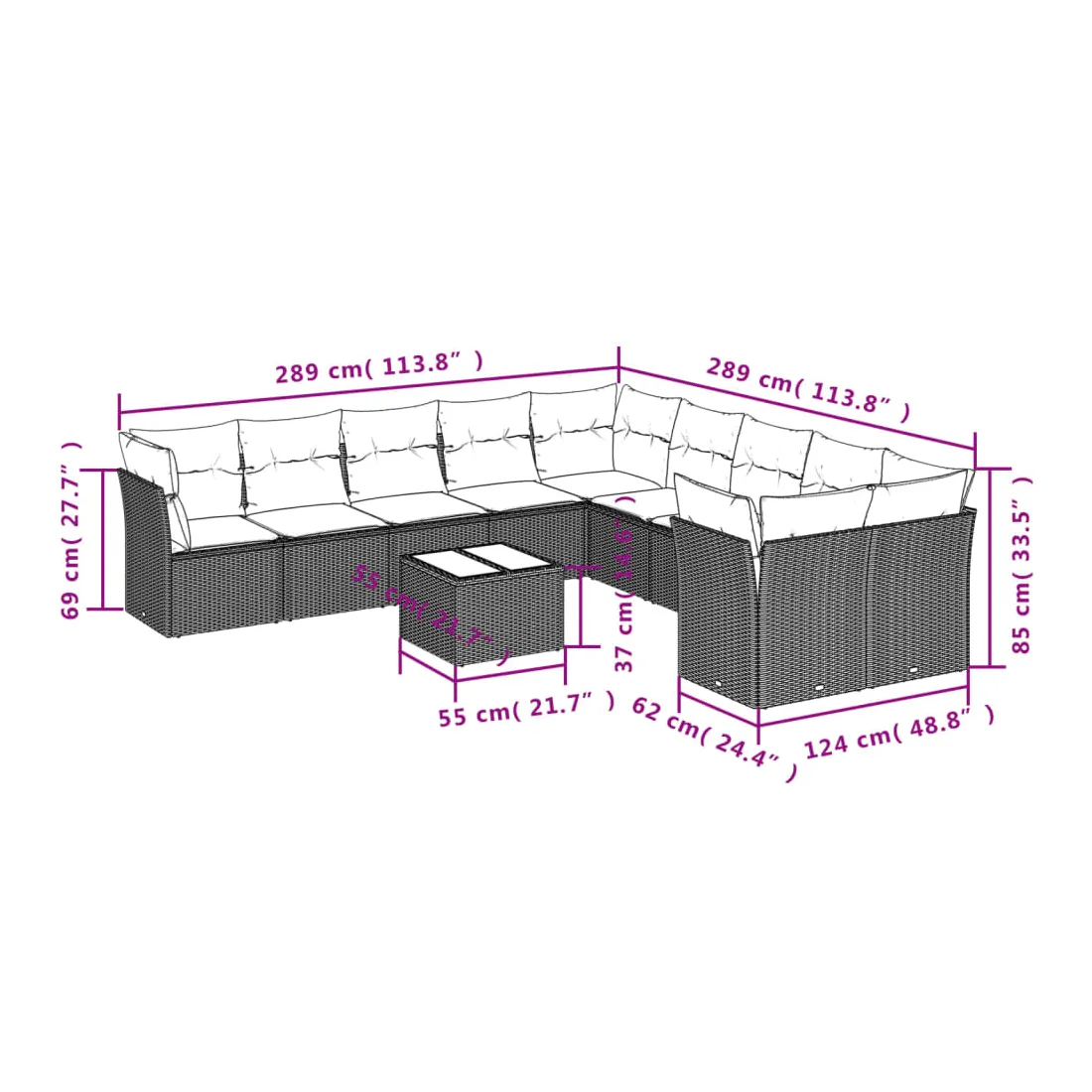 - Dimensions totales du canapé : 289 x 289 x 69 cm (l x P x H)