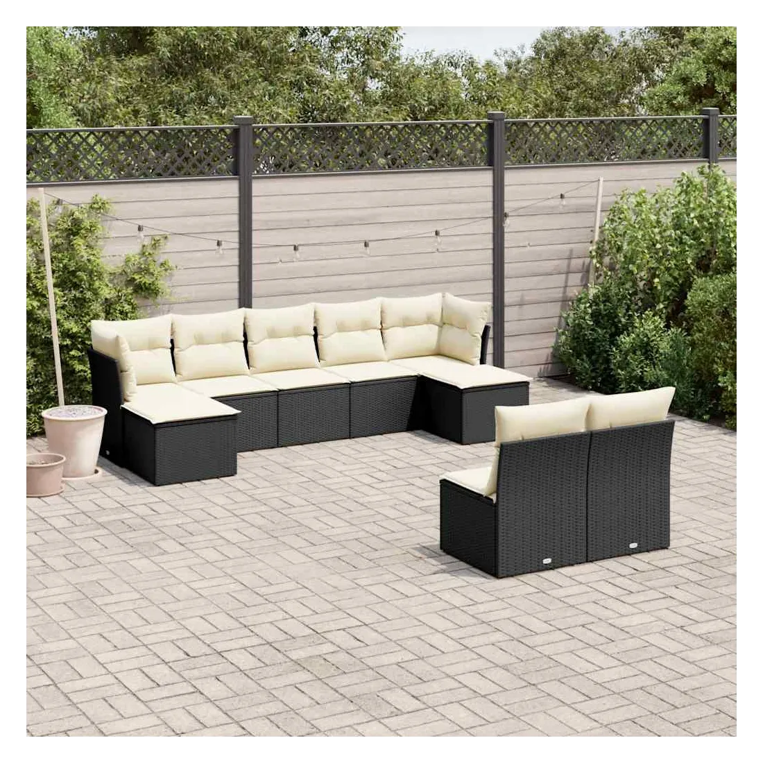 Cet ensemble de canapés de jardin est le complément parfait de votre arrière-cour, terrasse ou patio, offrant un espace confortable et accueillant pour discuter avec la famille et les amis ou simplement se détendre et profiter de l'extérieur. Matériau durable : la résine tressée, également connue sous le nom de poly rotin, est un matériau synthétique solide et nécessitant peu d'entretien qui ressemble au rotin naturel. Il est léger, facile à nettoyer et couramment utilisé pour les meubles d'extérieur en raison de sa durabilité et de ses propriétés de résistance aux intempéries.Fonction de rangement avec sac résistant à l'eau : chaque siège de jardin dispose d'un espace de rangement sous l'assise, complété par un sac résistant à l'eau pour ranger les coussins, les jouets et d'autres objets. Les sacs intérieurs sont dotés d'un couvercle et peuvent être solidement fixés aux sièges à l'aide de bandes auto-agrippantes pour plus de stabilité.Housse amovible et lavable : ces coussins de siège sont dotés de housses amovibles pour un lavage et un entretien faciles.Conception modulaire : cet ensemble de meubles d'extérieur a une conception modulaire, ce qui le rend complètement flexible et facile à déplacer, afin que vous puissiez créer un agencement de meubles d'extérieur personnalisé. Bon à savoir :Pour que vos meubles d'extérieur restent beaux, nous vous recommandons de les protéger avec une housse imperméable.