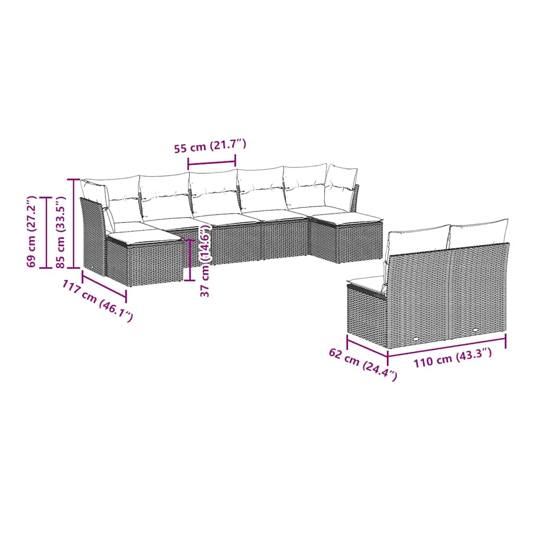 - 9 x coussin d'assise avec housse amovible et lavable