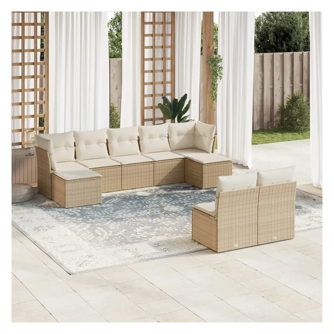 Cet ensemble de canapés de jardin est le complément parfait de votre arrière-cour, terrasse ou patio, offrant un espace confortable et accueillant pour discuter avec la famille et les amis ou simplement se détendre et profiter de l'extérieur. Matériau durable : la résine tressée, également connue sous le nom de poly rotin, est un matériau synthétique solide et nécessitant peu d'entretien qui ressemble au rotin naturel. Il est léger, facile à nettoyer et couramment utilisé pour les meubles d'extérieur en raison de sa durabilité et de ses propriétés de résistance aux intempéries.Fonction de rangement avec sac résistant à l'eau : chaque siège de jardin dispose d'un espace de rangement sous l'assise, complété par un sac résistant à l'eau pour ranger les coussins, les jouets et d'autres objets. Les sacs intérieurs sont dotés d'un couvercle et peuvent être solidement fixés aux sièges à l'aide de bandes auto-agrippantes pour plus de stabilité.Housse amovible et lavable : ces coussins de siège sont dotés de housses amovibles pour un lavage et un entretien faciles.Conception modulaire : cet ensemble de meubles d'extérieur a une conception modulaire, ce qui le rend complètement flexible et facile à déplacer, afin que vous puissiez créer un agencement de meubles d'extérieur personnalisé. Bon à savoir :Pour que vos meubles d'extérieur restent beaux, nous vous recommandons de les protéger avec une housse imperméable.