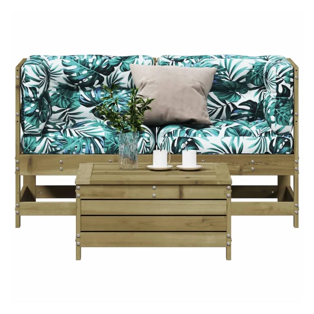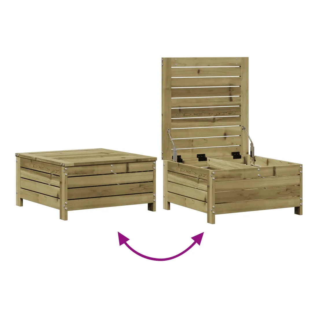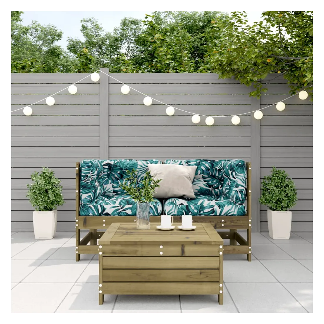 Cet ensemble de salon de jardin en bois avec un design à lattes sera un excellent complément à votre jardin, patio ou terrasse pour profiter d'un moment agréable avec votre famille ou vos amis. Bois imprégné : le bois de pin massif est un matériau naturel magnifique. Le bois de pin a un grain droit et les nœuds lui confèrent un aspect rustique caractéristique. L'imprégnation est un processus de conservation réalisé à l'aide d'autoclaves. Le traitement sous pression augmente la résistance à la pourriture et aux intempéries.Design à lattes : le design à lattes de la chaise de jardin en bois empêche l'accumulation de l'eau, ce qui permet de garder le siège au sec et d'éviter un pourrissement inutile.Expérience d'assise confortable : le dossier et l'accoudoir ajoutent un confort d'assise supplémentaire à l'ensemble de meubles de jardin. De plus, le coussin bien rembourré vous permet de vous asseoir confortablement.Utilisation polyvalente : le pouf d'extérieur avec couvercle peut non seulement être utilisé pour s'asseoir ou se détendre, mais il peut également être utilisé comme table basse pour contenir vos boissons, votre nourriture et le meuble de jardin dispose d'un espace de rangement sous le siège. Conception modulaire : cet ensemble de meubles d'extérieur a une conception modulaire, ce qui le rend complètement flexible et facile à déplacer, afin que vous puissiez créer un agencement de meubles d'extérieur personnalisé. Bon à savoir :Pour que vos meubles d'extérieur restent beaux, nous vous recommandons de les protéger avec une housse imperméable.