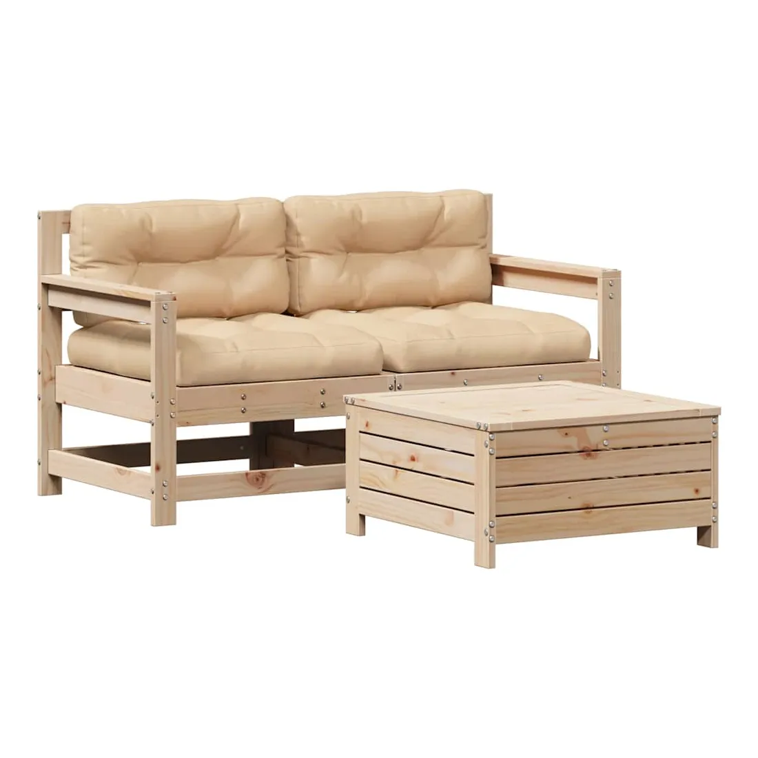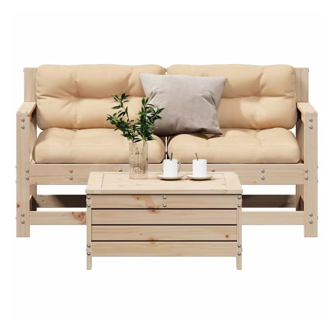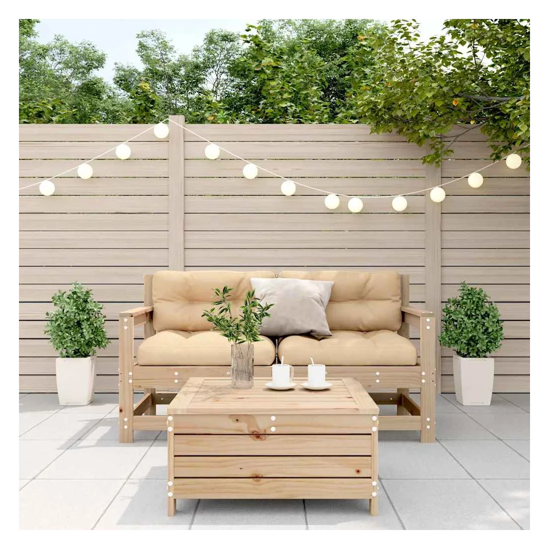 Cet ensemble de salon de jardin en bois avec un design à lattes sera un excellent complément à votre jardin, patio ou terrasse pour profiter d'un moment agréable avec votre famille ou vos amis. Bois de pin massif : le bois de pin massif est un matériau naturel magnifique. Le bois de pin a un grain droit et les nœuds donnent au matériau son aspect caractéristique et rustique.Design à lattes : le design à lattes de la chaise de jardin en bois empêche l'accumulation de l'eau, ce qui permet de garder le siège au sec et d'éviter un pourrissement inutile.Expérience d'assise confortable : le dossier et l'accoudoir ajoutent un confort d'assise supplémentaire à l'ensemble de meubles de jardin. De plus, le coussin bien rembourré vous permet de vous asseoir confortablement.Utilisation polyvalente : le pouf d'extérieur avec couvercle peut non seulement être utilisé pour s'asseoir ou se détendre, mais il peut également être utilisé comme table basse pour contenir vos boissons, votre nourriture et le meuble de jardin dispose d'un espace de rangement sous le siège. Conception modulaire : cet ensemble de meubles d'extérieur a une conception modulaire, ce qui le rend complètement flexible et facile à déplacer, afin que vous puissiez créer un agencement de meubles d'extérieur personnalisé. Bon à savoir :Pour que vos meubles d'extérieur restent beaux, nous vous recommandons de les protéger avec une housse imperméable.