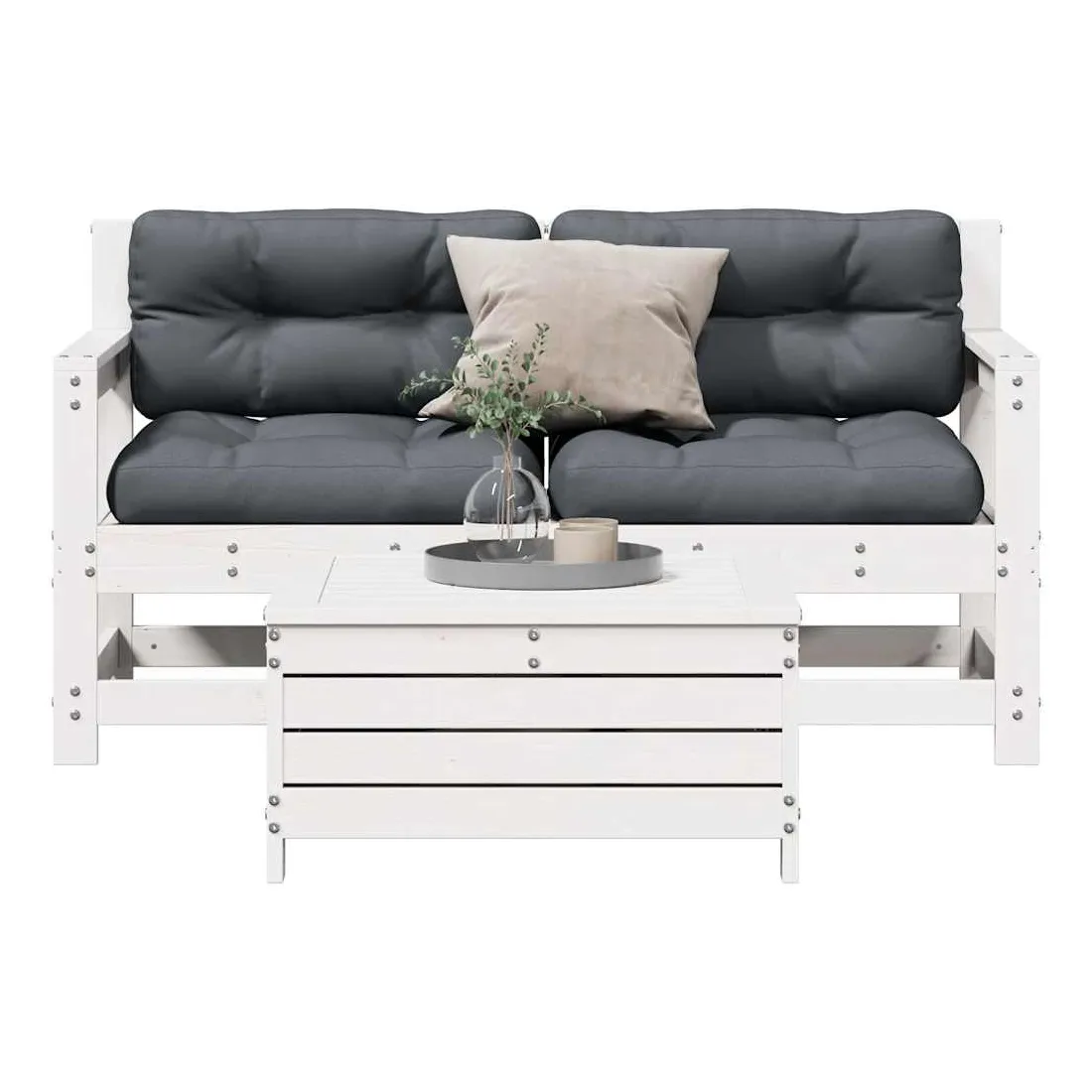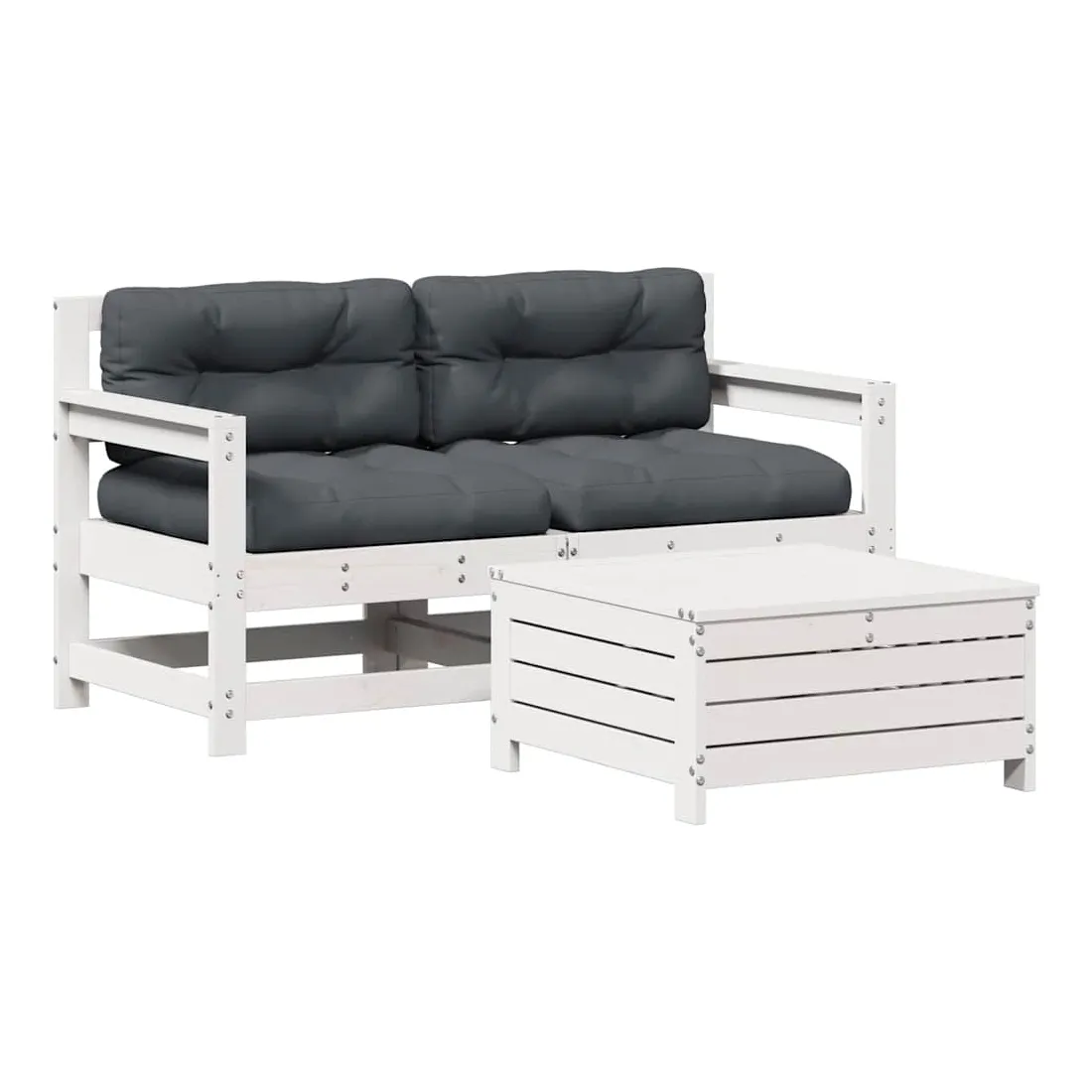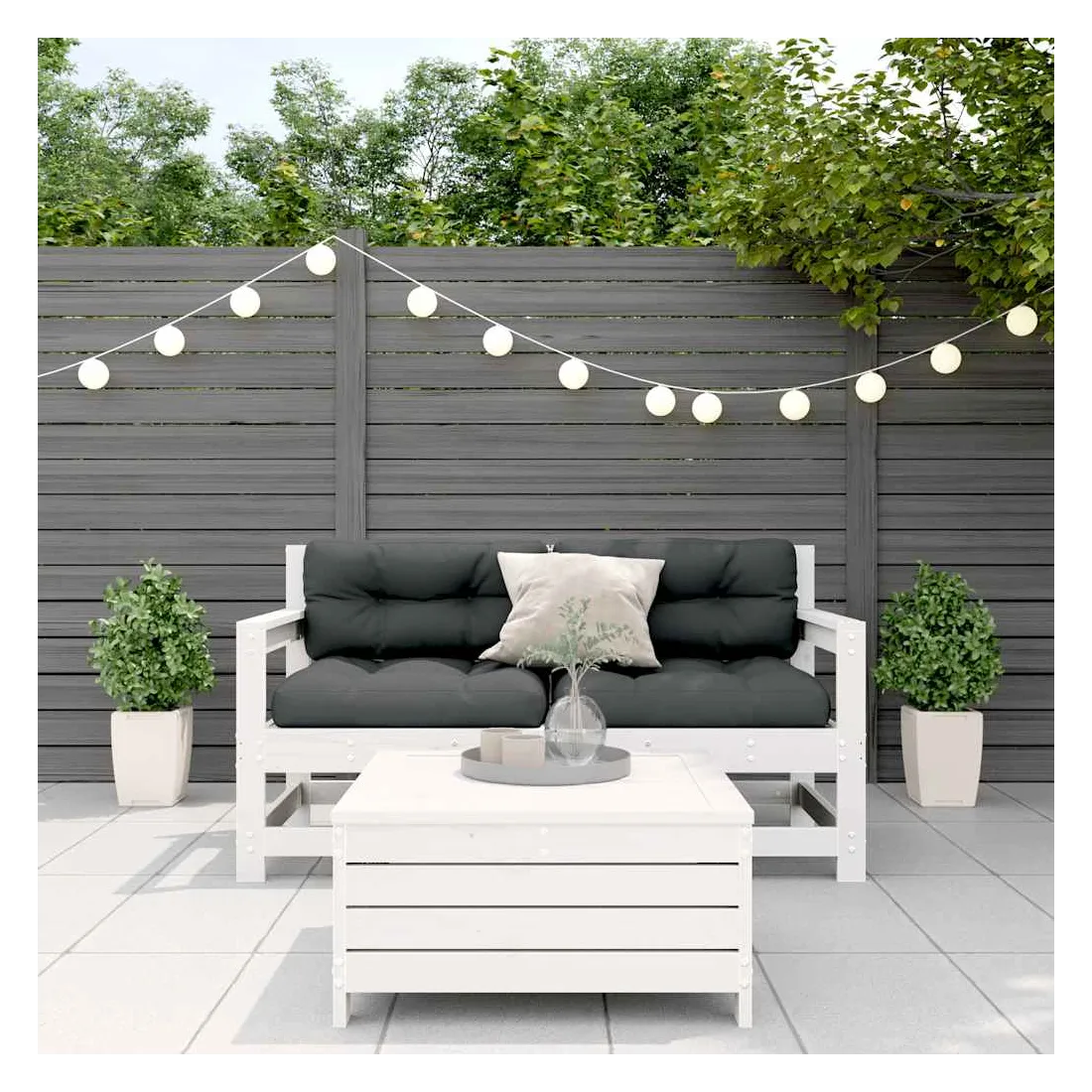 Cet ensemble de salon de jardin en bois avec un design à lattes sera un excellent complément à votre jardin, patio ou terrasse pour profiter d'un moment agréable avec votre famille ou vos amis. Bois de pin massif : le bois de pin massif est un matériau naturel magnifique. Le bois de pin a un grain droit et les nœuds donnent au matériau son aspect caractéristique et rustique.Design à lattes : le design à lattes de la chaise de jardin en bois empêche l'accumulation de l'eau, ce qui permet de garder le siège au sec et d'éviter un pourrissement inutile.Expérience d'assise confortable : le dossier et l'accoudoir ajoutent un confort d'assise supplémentaire à l'ensemble de meubles de jardin. De plus, le coussin bien rembourré vous permet de vous asseoir confortablement.Utilisation polyvalente : le pouf d'extérieur avec couvercle peut non seulement être utilisé pour s'asseoir ou se détendre, mais il peut également être utilisé comme table basse pour contenir vos boissons, votre nourriture et le meuble de jardin dispose d'un espace de rangement sous le siège. Conception modulaire : cet ensemble de meubles d'extérieur a une conception modulaire, ce qui le rend complètement flexible et facile à déplacer, afin que vous puissiez créer un agencement de meubles d'extérieur personnalisé. Bon à savoir :Pour que vos meubles d'extérieur restent beaux, nous vous recommandons de les protéger avec une housse imperméable.