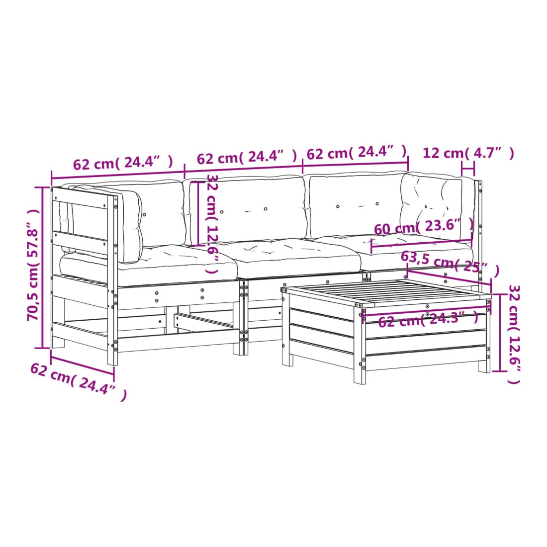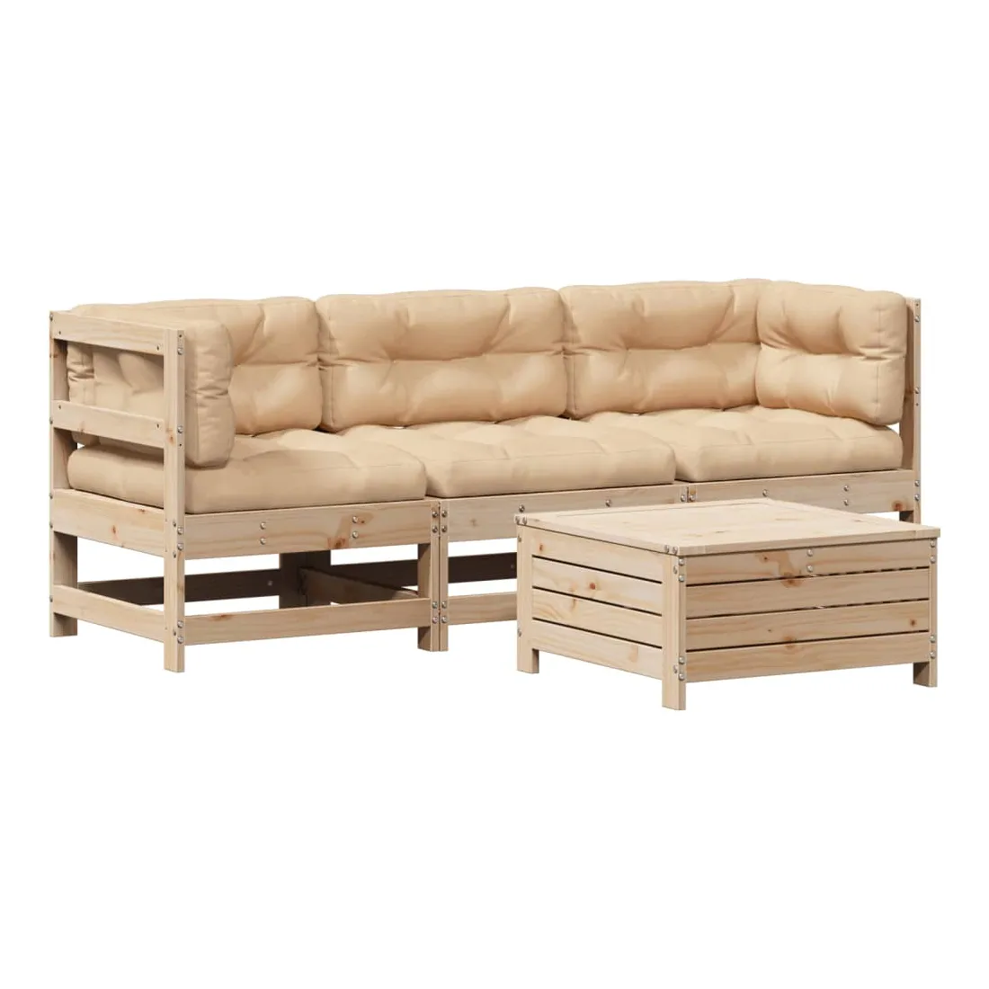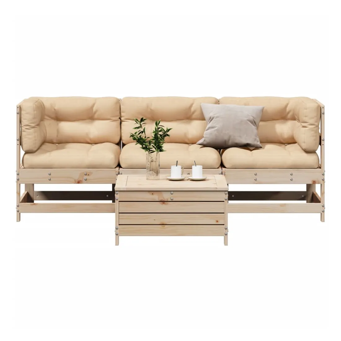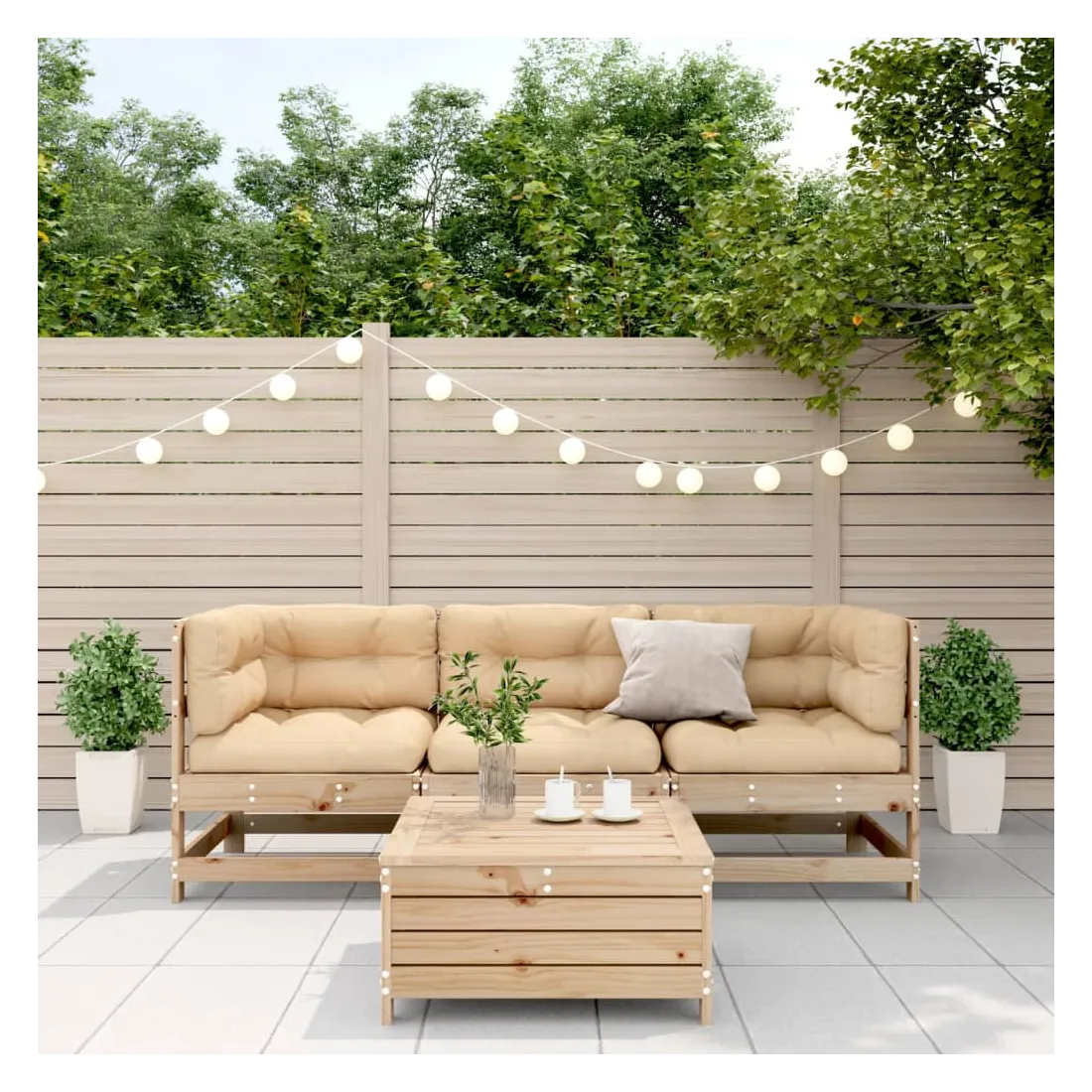 Cet ensemble de salon de jardin en bois avec un design à lattes sera un excellent complément à votre jardin, patio ou terrasse pour profiter d'un moment agréable avec votre famille ou vos amis. Bois de pin massif : le bois de pin massif est un matériau naturel magnifique. Le bois de pin a un grain droit et les nœuds donnent au matériau son aspect caractéristique et rustique.Design à lattes : le design à lattes de la chaise de jardin en bois empêche l'accumulation de l'eau, ce qui permet de garder le siège au sec et d'éviter un pourrissement inutile.Expérience d'assise confortable : le dossier et l'accoudoir ajoutent un confort d'assise supplémentaire à l'ensemble de meubles de jardin. De plus, le coussin bien rembourré vous permet de vous asseoir confortablement.Utilisation polyvalente : le pouf d'extérieur avec couvercle peut non seulement être utilisé pour s'asseoir ou se détendre, mais il peut également être utilisé comme table basse pour contenir vos boissons, votre nourriture et le meuble de jardin dispose d'un espace de rangement sous le siège. Conception modulaire : cet ensemble de meubles d'extérieur a une conception modulaire, ce qui le rend complètement flexible et facile à déplacer, afin que vous puissiez créer un agencement de meubles d'extérieur personnalisé. Bon à savoir :Pour que vos meubles d'extérieur restent beaux, nous vous recommandons de les protéger avec une housse imperméable.