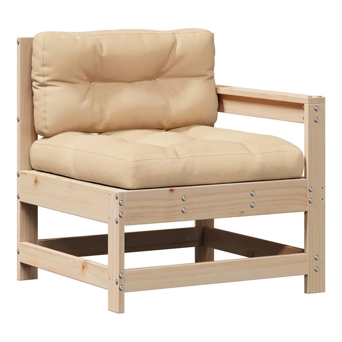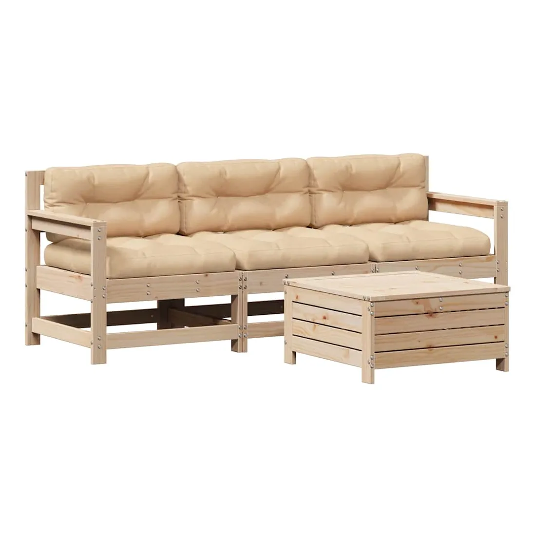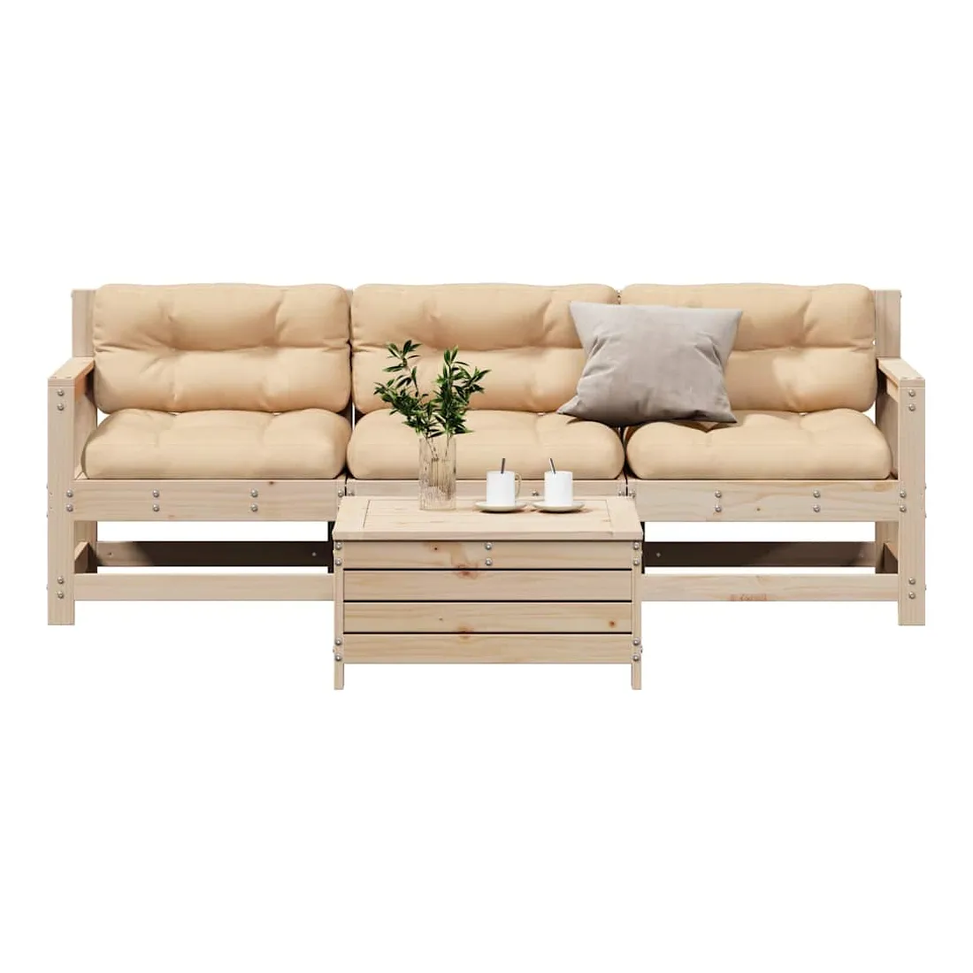 Cet ensemble de salon de jardin en bois avec un design à lattes sera un excellent complément à votre jardin, patio ou terrasse pour profiter d'un moment agréable avec votre famille ou vos amis. Bois de pin massif : le bois de pin massif est un matériau naturel magnifique. Le bois de pin a un grain droit et les nœuds donnent au matériau son aspect caractéristique et rustique.Design à lattes : le design à lattes de la chaise de jardin en bois empêche l'accumulation de l'eau, ce qui permet de garder le siège au sec et d'éviter un pourrissement inutile.Expérience d'assise confortable : le dossier et l'accoudoir ajoutent un confort d'assise supplémentaire à l'ensemble de meubles de jardin. De plus, le coussin bien rembourré vous permet de vous asseoir confortablement.Utilisation polyvalente : le pouf d'extérieur avec couvercle peut non seulement être utilisé pour s'asseoir ou se détendre, mais il peut également être utilisé comme table basse pour contenir vos boissons, votre nourriture et le meuble de jardin dispose d'un espace de rangement sous le siège. Conception modulaire : cet ensemble de meubles d'extérieur a une conception modulaire, ce qui le rend complètement flexible et facile à déplacer, afin que vous puissiez créer un agencement de meubles d'extérieur personnalisé. Bon à savoir :Pour que vos meubles d'extérieur restent beaux, nous vous recommandons de les protéger avec une housse imperméable.