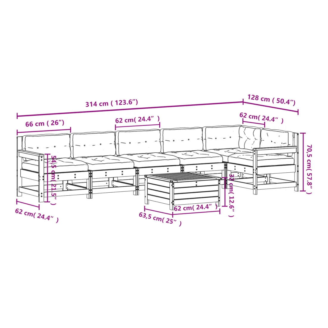 - Dimensions du canapé central de jardin : 62 x 62 x 70,5 cm (l x P x H)