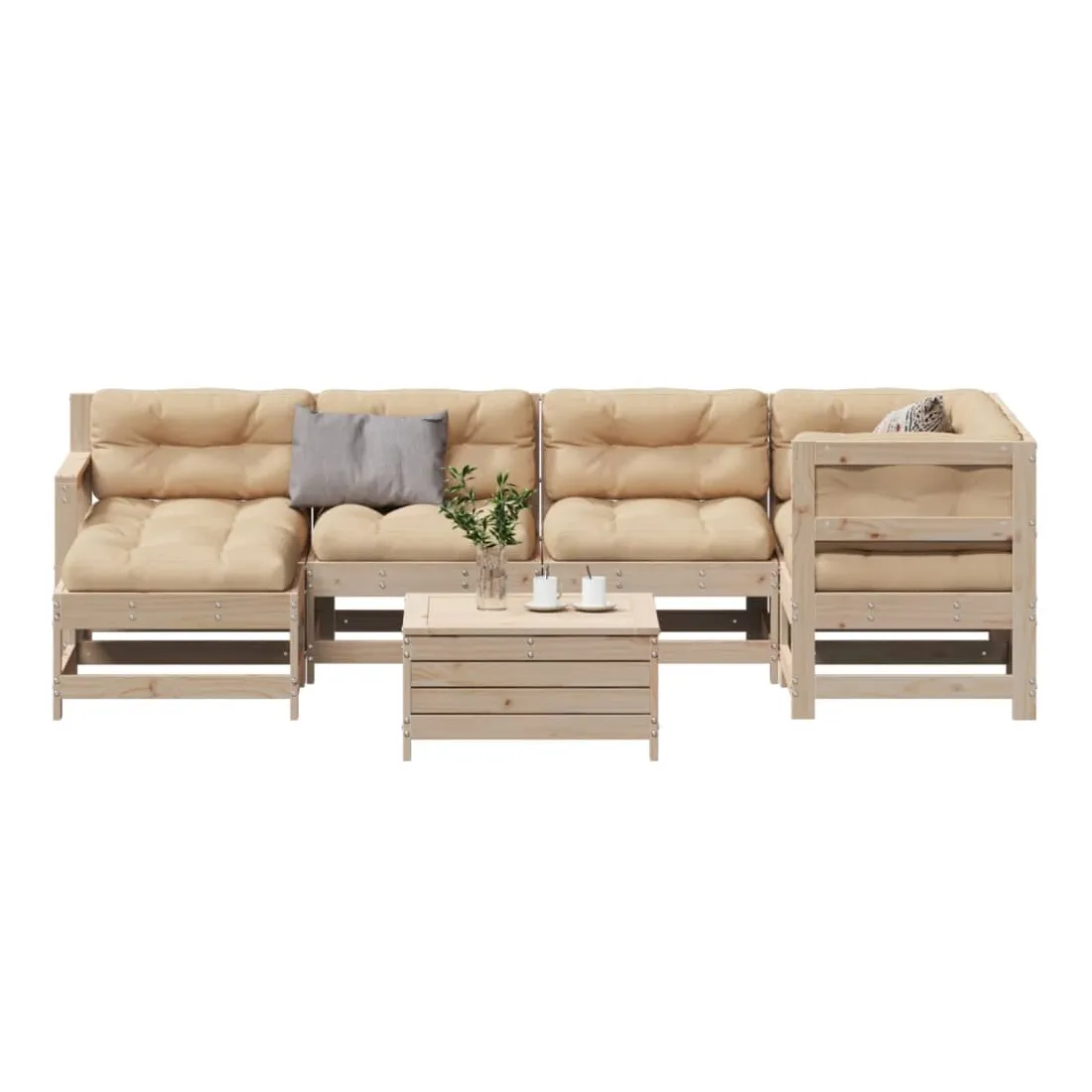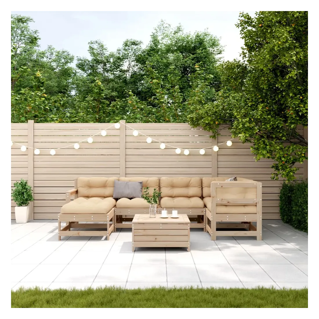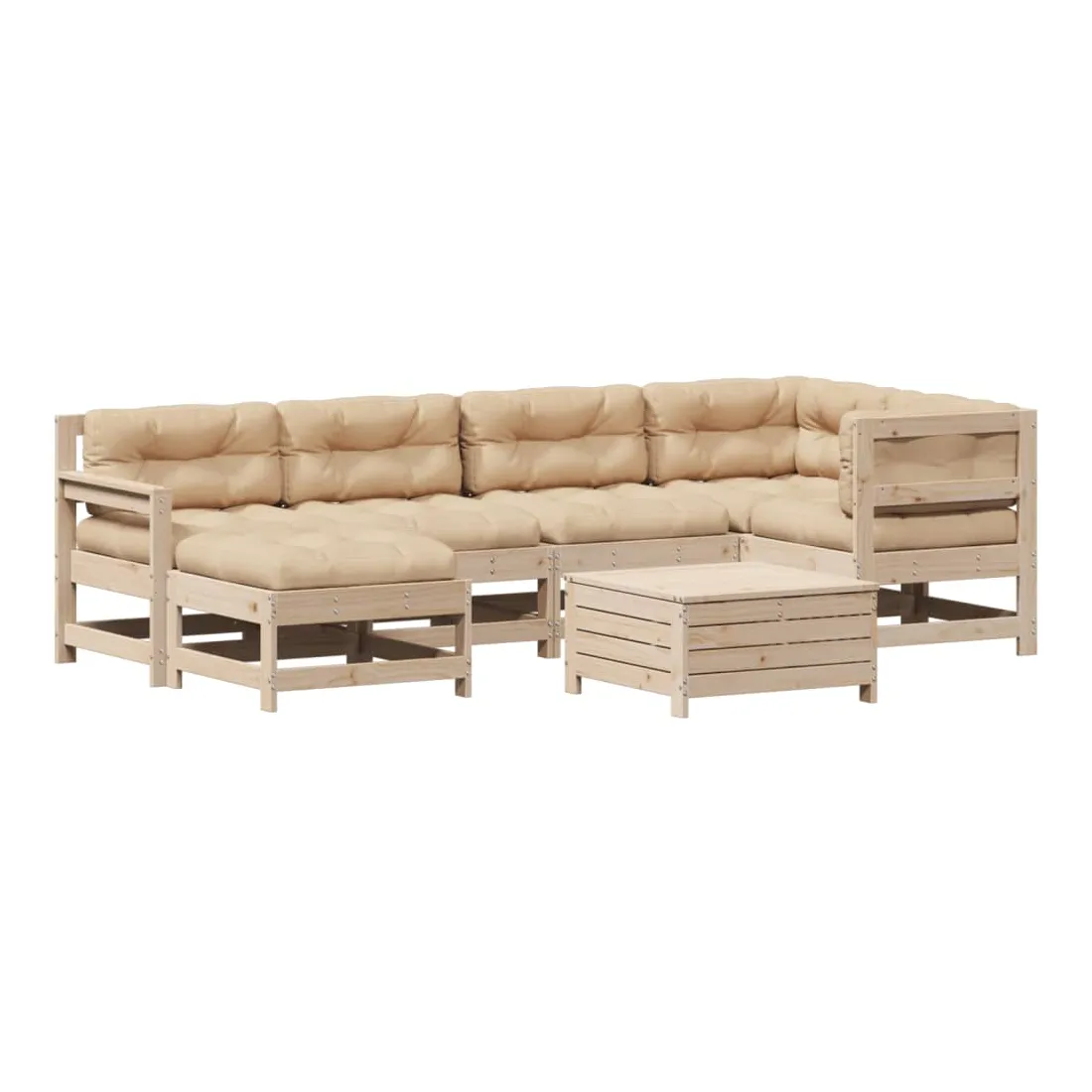 Cet ensemble de salon de jardin en bois avec un design à lattes sera un excellent complément à votre jardin, patio ou terrasse pour profiter d'un moment agréable avec votre famille ou vos amis. Bois de pin massif : le bois de pin massif est un matériau naturel magnifique. Le bois de pin a un grain droit et les nœuds donnent au matériau son aspect caractéristique et rustique.Design à lattes : le design à lattes de la chaise de jardin en bois empêche l'accumulation de l'eau, ce qui permet de garder le siège au sec et d'éviter un pourrissement inutile.Expérience d'assise confortable : le dossier et l'accoudoir ajoutent un confort d'assise supplémentaire à l'ensemble de meubles de jardin. De plus, le coussin bien rembourré vous permet de vous asseoir confortablement.Utilisation polyvalente : le pouf d'extérieur avec couvercle peut non seulement être utilisé pour s'asseoir ou se détendre, mais il peut également être utilisé comme table basse pour contenir vos boissons, votre nourriture et le meuble de jardin dispose d'un espace de rangement sous le siège. Conception modulaire : cet ensemble de meubles d'extérieur a une conception modulaire, ce qui le rend complètement flexible et facile à déplacer, afin que vous puissiez créer un agencement de meubles d'extérieur personnalisé. Bon à savoir :Pour que vos meubles d'extérieur restent beaux, nous vous recommandons de les protéger avec une housse imperméable.