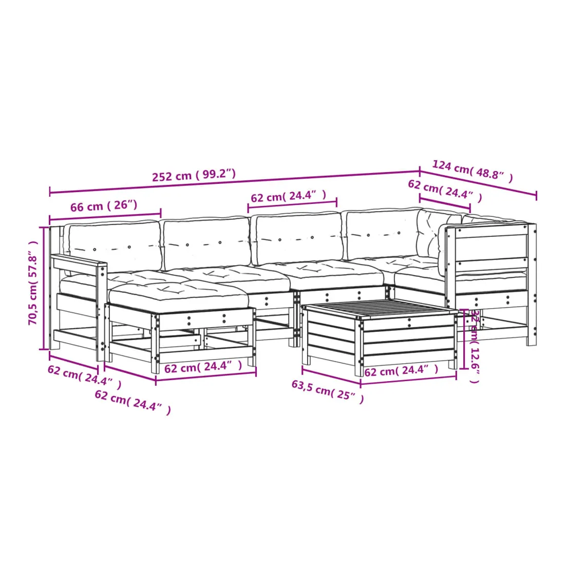 - Dimensions du canapé d'angle de jardin : 62 x 62 x 70,5 cm (l x P x H)