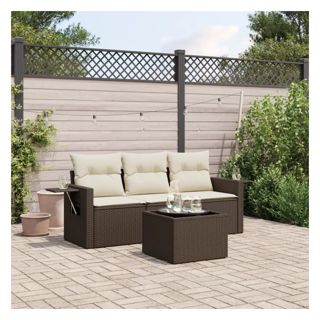 Cet ensemble de canapés de jardin est le complément parfait de votre arrière-cour, terrasse ou patio, offrant un espace confortable et accueillant pour discuter avec la famille et les amis ou simplement se détendre et profiter de l'extérieur. Matériau durable : la résine tressée, également connue sous le nom de poly rotin, est un matériau synthétique solide et nécessitant peu d'entretien qui ressemble au rotin naturel. Il est léger, facile à nettoyer et couramment utilisé pour les meubles d'extérieur en raison de sa durabilité et de ses propriétés de résistance aux intempéries.Fonction de rangement avec sac résistant à l'eau : le mobilier de jardin dispose d'un espace de rangement sous l'assise, complété par un sac résistant à l'eau pour ranger coussins, jouets et autres objets. Le sac intérieur peut être solidement fixé au mobilier d'extérieur grâce à des attaches auto-agrippantes pour plus de stabilité.Table d'appoint pratique : ce mobilier d'extérieur comprend une table d'appoint pliable avec un ressort à gaz sur les accoudoirs, offrant un endroit pratique pour garder vos essentiels à portée de main.Housse amovible et lavable : ces coussins de siège sont dotés de housses amovibles pour un lavage et un entretien faciles.Conception modulaire : cet ensemble de meubles d'extérieur a une conception modulaire, ce qui le rend complètement flexible et facile à déplacer, afin que vous puissiez créer un agencement de meubles d'extérieur personnalisé. Bon à savoir :Pour que vos meubles d'extérieur restent beaux, nous vous recommandons de les protéger avec une housse imperméable.