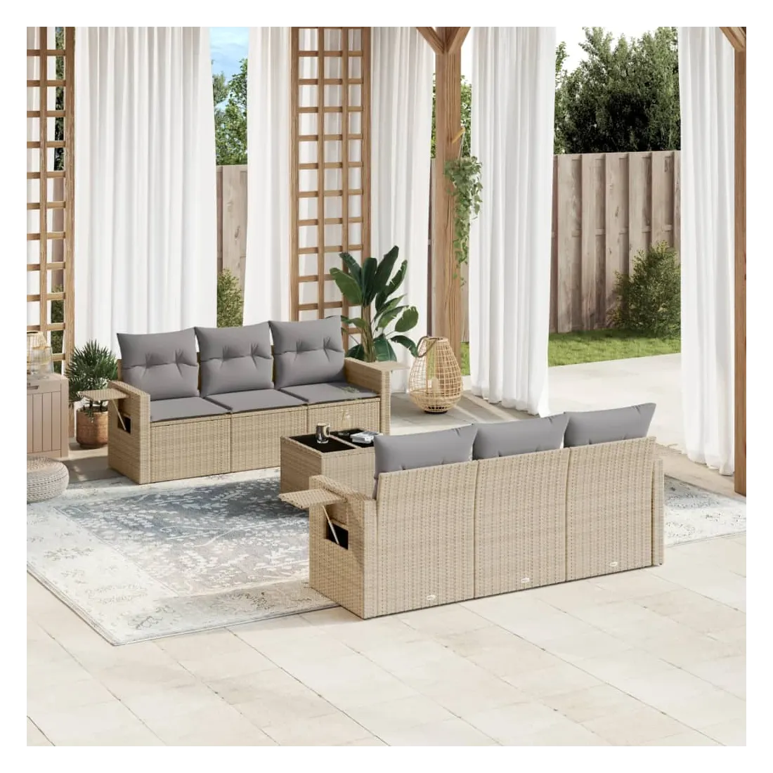 Cet ensemble de canapés de jardin est le complément parfait de votre arrière-cour, terrasse ou patio, offrant un espace confortable et accueillant pour discuter avec la famille et les amis ou simplement se détendre et profiter de l'extérieur. Matériau durable : la résine tressée, également connue sous le nom de poly rotin, est un matériau synthétique solide et nécessitant peu d'entretien qui ressemble au rotin naturel. Il est léger, facile à nettoyer et couramment utilisé pour les meubles d'extérieur en raison de sa durabilité et de ses propriétés de résistance aux intempéries.Fonction de rangement avec sac résistant à l'eau : le mobilier de jardin dispose d'un espace de rangement sous l'assise, complété par un sac résistant à l'eau pour ranger coussins, jouets et autres objets. Le sac intérieur peut être solidement fixé au mobilier d'extérieur grâce à des attaches auto-agrippantes pour plus de stabilité.Table d'appoint pratique : ce mobilier d'extérieur comprend une table d'appoint pliable avec un ressort à gaz sur les accoudoirs, offrant un endroit pratique pour garder vos essentiels à portée de main.Housse amovible et lavable : ces coussins de siège sont dotés de housses amovibles pour un lavage et un entretien faciles.Conception modulaire : cet ensemble de meubles d'extérieur a une conception modulaire, ce qui le rend complètement flexible et facile à déplacer, afin que vous puissiez créer un agencement de meubles d'extérieur personnalisé. Bon à savoir :Pour que vos meubles d'extérieur restent beaux, nous vous recommandons de les protéger avec une housse imperméable.