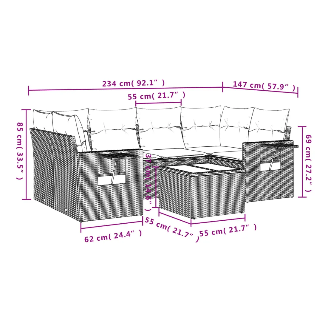 Cet ensemble de canapés de jardin est le complément parfait de votre arrière-cour, terrasse ou patio, offrant un espace confortable et accueillant pour discuter avec la famille et les amis ou simplement se détendre et profiter de l'extérieur. Matériau durable : la résine tressée, également connue sous le nom de poly rotin, est un matériau synthétique solide et nécessitant peu d'entretien qui ressemble au rotin naturel. Il est léger, facile à nettoyer et couramment utilisé pour les meubles d'extérieur en raison de sa durabilité et de ses propriétés de résistance aux intempéries.Fonction de rangement avec sac résistant à l'eau : le mobilier de jardin dispose d'un espace de rangement sous l'assise, complété par un sac résistant à l'eau pour ranger coussins, jouets et autres objets. Le sac intérieur peut être solidement fixé au mobilier d'extérieur grâce à des attaches auto-agrippantes pour plus de stabilité.Table d'appoint pratique : ce mobilier d'extérieur comprend une table d'appoint pliable avec un ressort à gaz sur les accoudoirs, offrant un endroit pratique pour garder vos essentiels à portée de main.Housse amovible et lavable : ces coussins de siège sont dotés de housses amovibles pour un lavage et un entretien faciles.Conception modulaire : cet ensemble de meubles d'extérieur a une conception modulaire, ce qui le rend complètement flexible et facile à déplacer, afin que vous puissiez créer un agencement de meubles d'extérieur personnalisé. Bon à savoir :Pour que vos meubles d'extérieur restent beaux, nous vous recommandons de les protéger avec une housse imperméable.