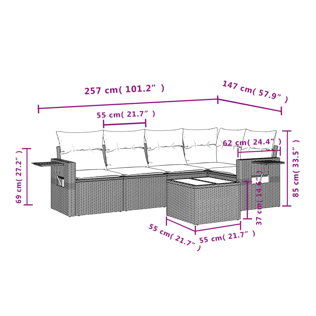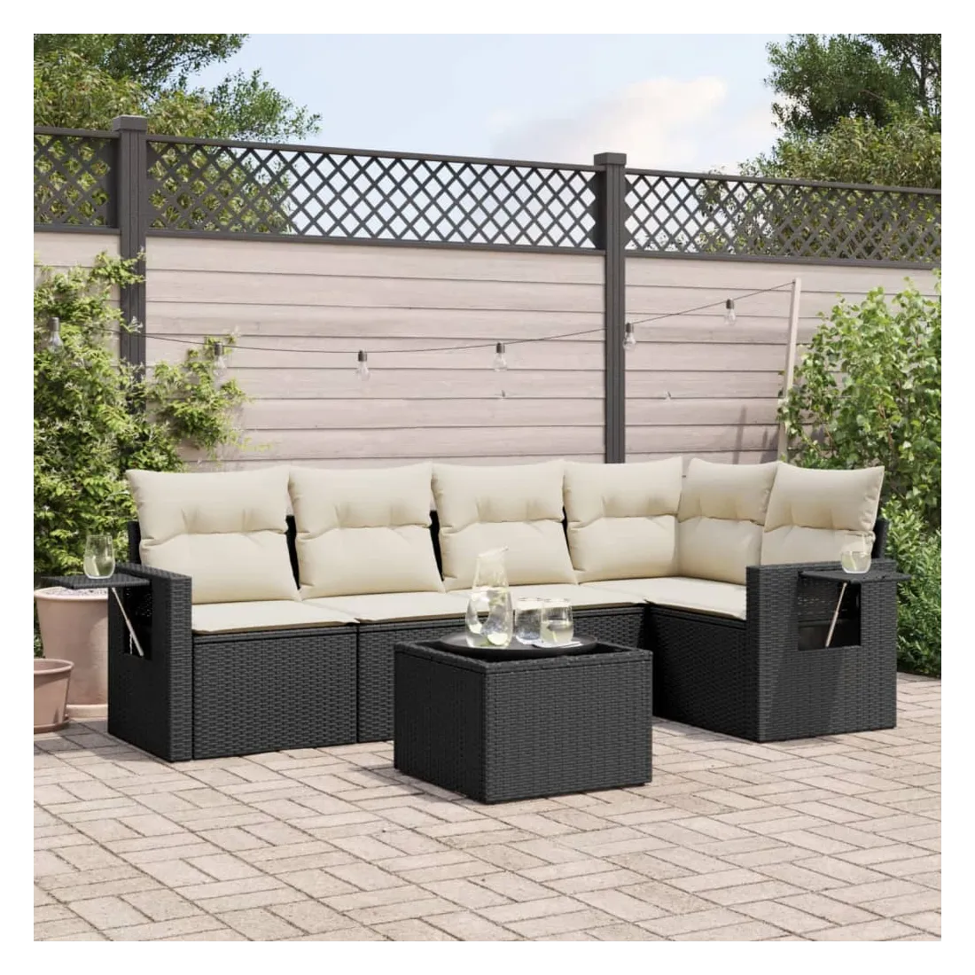 Cet ensemble de canapés de jardin est le complément parfait de votre arrière-cour, terrasse ou patio, offrant un espace confortable et accueillant pour discuter avec la famille et les amis ou simplement se détendre et profiter de l'extérieur. Matériau durable : la résine tressée, également connue sous le nom de poly rotin, est un matériau synthétique solide et nécessitant peu d'entretien qui ressemble au rotin naturel. Il est léger, facile à nettoyer et couramment utilisé pour les meubles d'extérieur en raison de sa durabilité et de ses propriétés de résistance aux intempéries.Fonction de rangement avec sac résistant à l'eau : le mobilier de jardin dispose d'un espace de rangement sous l'assise, complété par un sac résistant à l'eau pour ranger coussins, jouets et autres objets. Le sac intérieur peut être solidement fixé au mobilier d'extérieur grâce à des attaches auto-agrippantes pour plus de stabilité.Table d'appoint pratique : ce mobilier d'extérieur comprend une table d'appoint pliable avec un ressort à gaz sur les accoudoirs, offrant un endroit pratique pour garder vos essentiels à portée de main.Housse amovible et lavable : ces coussins de siège sont dotés de housses amovibles pour un lavage et un entretien faciles.Conception modulaire : cet ensemble de meubles d'extérieur a une conception modulaire, ce qui le rend complètement flexible et facile à déplacer, afin que vous puissiez créer un agencement de meubles d'extérieur personnalisé. Bon à savoir :Pour que vos meubles d'extérieur restent beaux, nous vous recommandons de les protéger avec une housse imperméable.