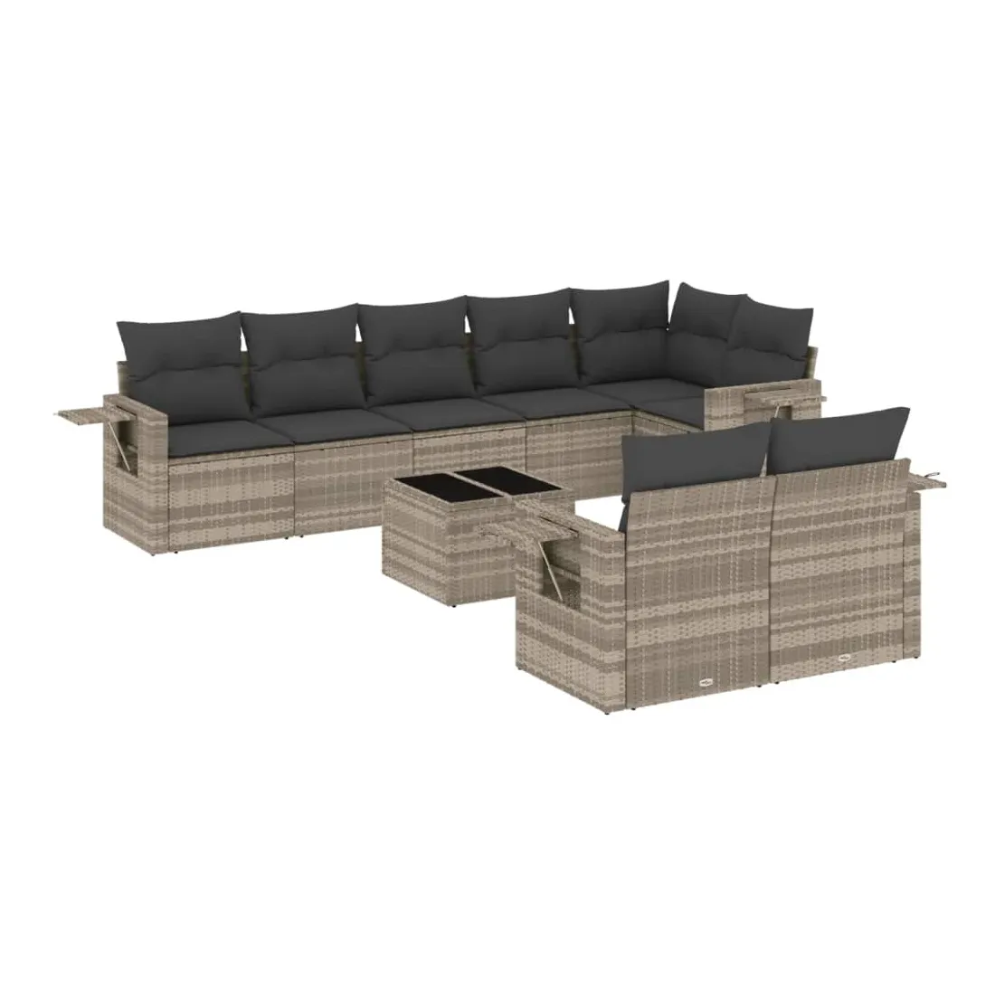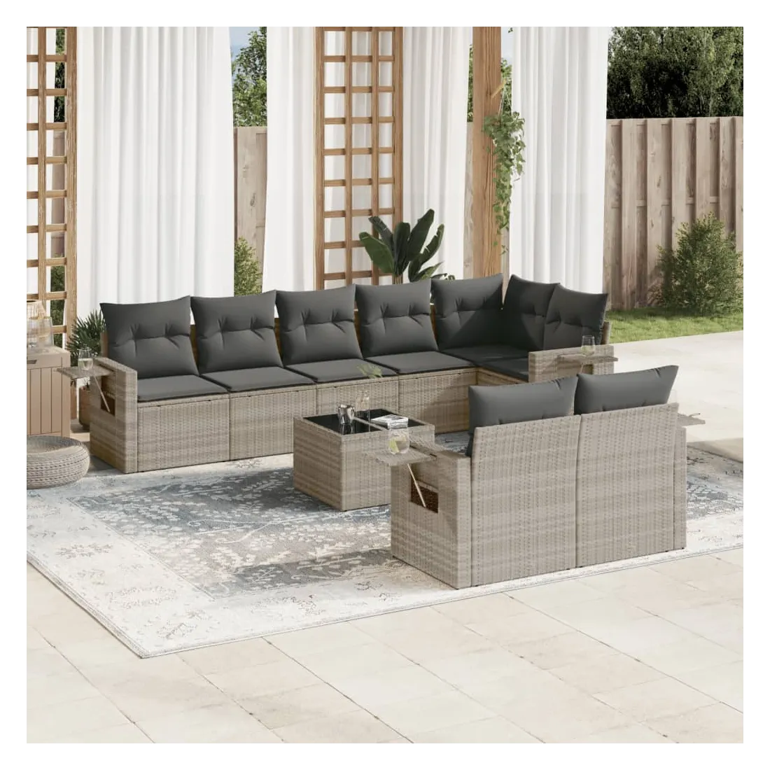 Cet ensemble de canapés de jardin est le complément parfait de votre arrière-cour, terrasse ou patio, offrant un espace confortable et accueillant pour discuter avec la famille et les amis ou simplement se détendre et profiter de l'extérieur. Matériau durable : la résine tressée, également connue sous le nom de poly rotin, est un matériau synthétique solide et nécessitant peu d'entretien qui ressemble au rotin naturel. Il est léger, facile à nettoyer et couramment utilisé pour les meubles d'extérieur en raison de sa durabilité et de ses propriétés de résistance aux intempéries.Fonction de rangement avec sac résistant à l'eau : le mobilier de jardin dispose d'un espace de rangement sous l'assise, complété par un sac résistant à l'eau pour ranger coussins, jouets et autres objets. Le sac intérieur peut être solidement fixé au mobilier d'extérieur grâce à des attaches auto-agrippantes pour plus de stabilité.Table d'appoint pratique : ce mobilier d'extérieur comprend une table d'appoint pliable avec un ressort à gaz sur les accoudoirs, offrant un endroit pratique pour garder vos essentiels à portée de main.Housse amovible et lavable : ces coussins de siège sont dotés de housses amovibles pour un lavage et un entretien faciles.Conception modulaire : cet ensemble de meubles d'extérieur a une conception modulaire, ce qui le rend complètement flexible et facile à déplacer, afin que vous puissiez créer un agencement de meubles d'extérieur personnalisé. Bon à savoir :Pour que vos meubles d'extérieur restent beaux, nous vous recommandons de les protéger avec une housse imperméable.
