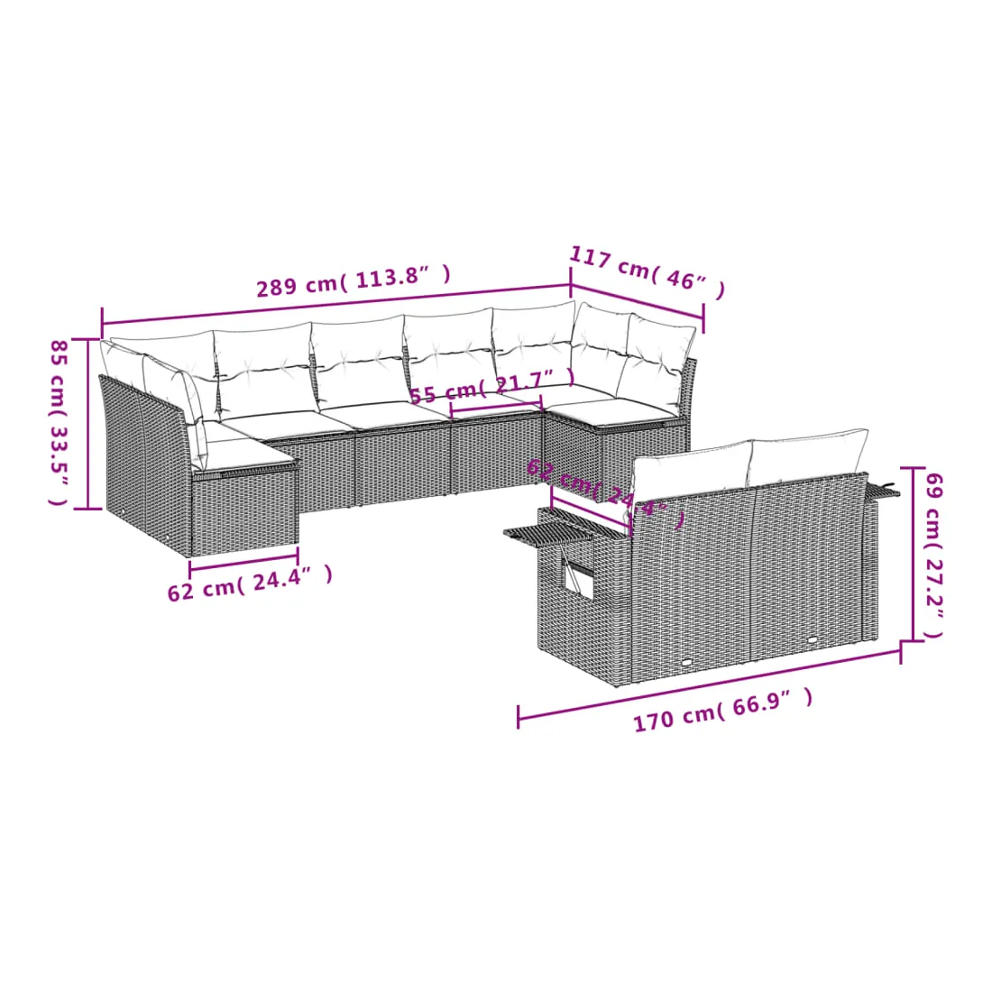 • 9 x coussin d'assise avec housse amovible et lavable