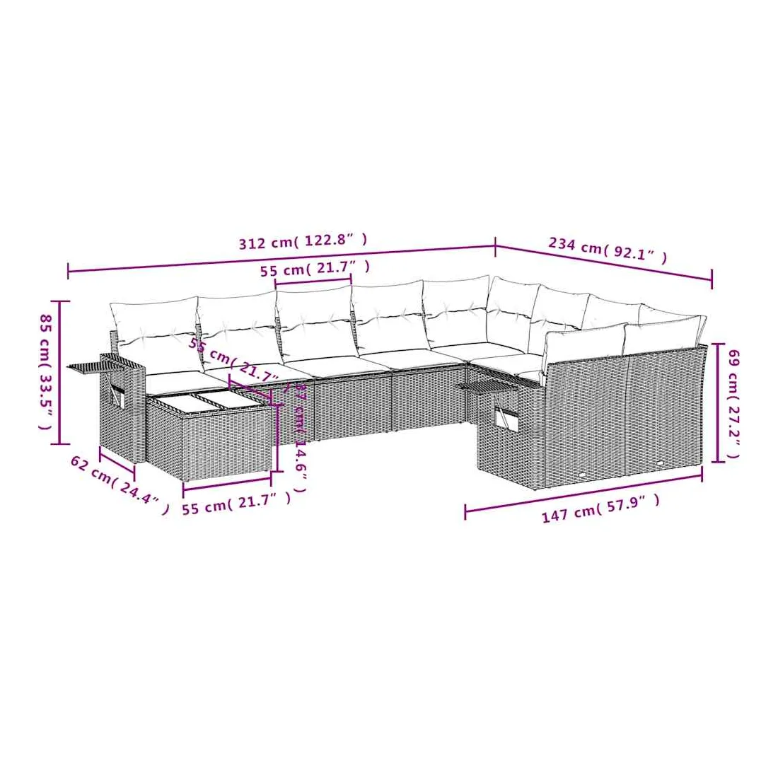 • 9 x coussin d'assise avec housse amovible et lavable