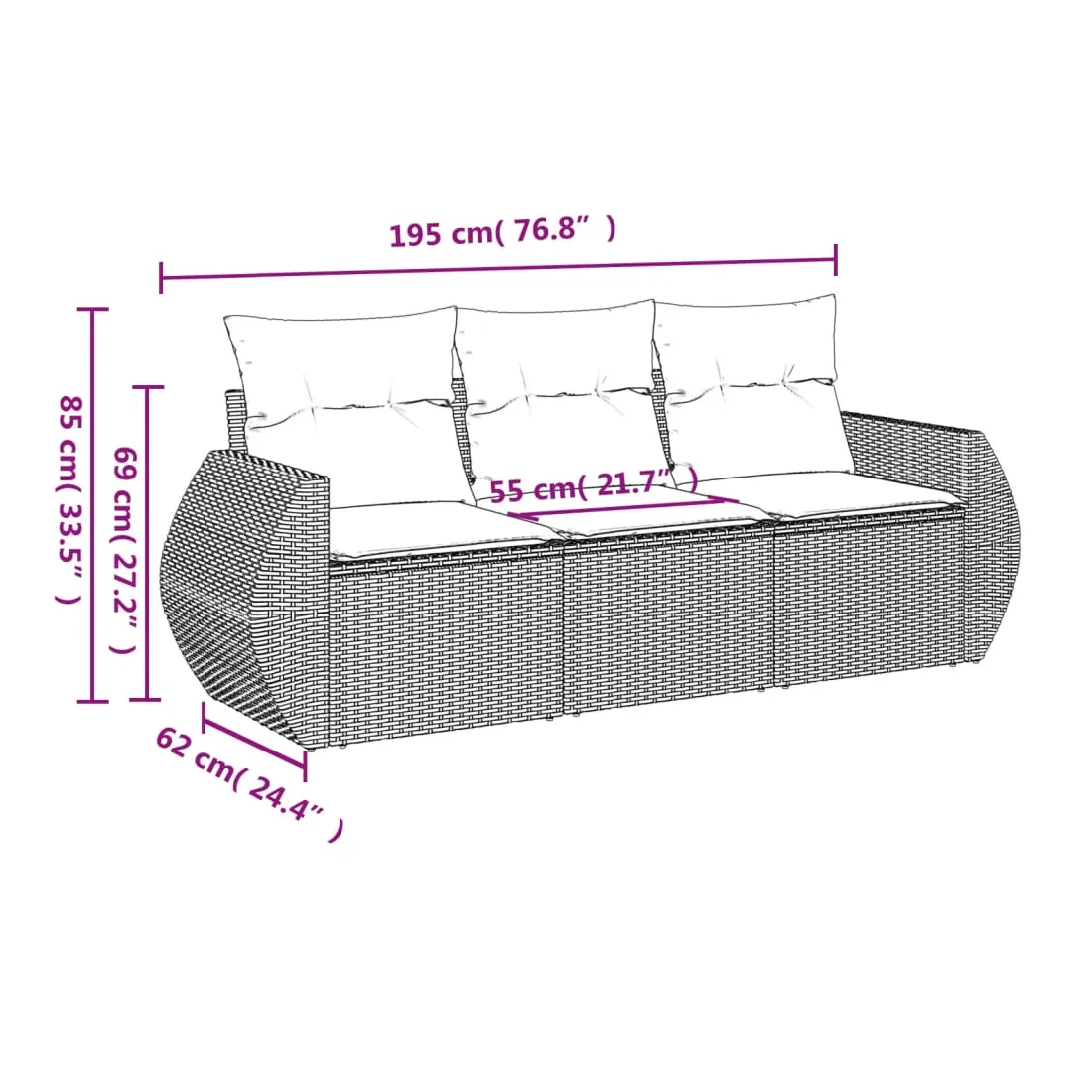 - Dimensions totales du canapé : 195 x 62 x 69 cm (l x P x H)