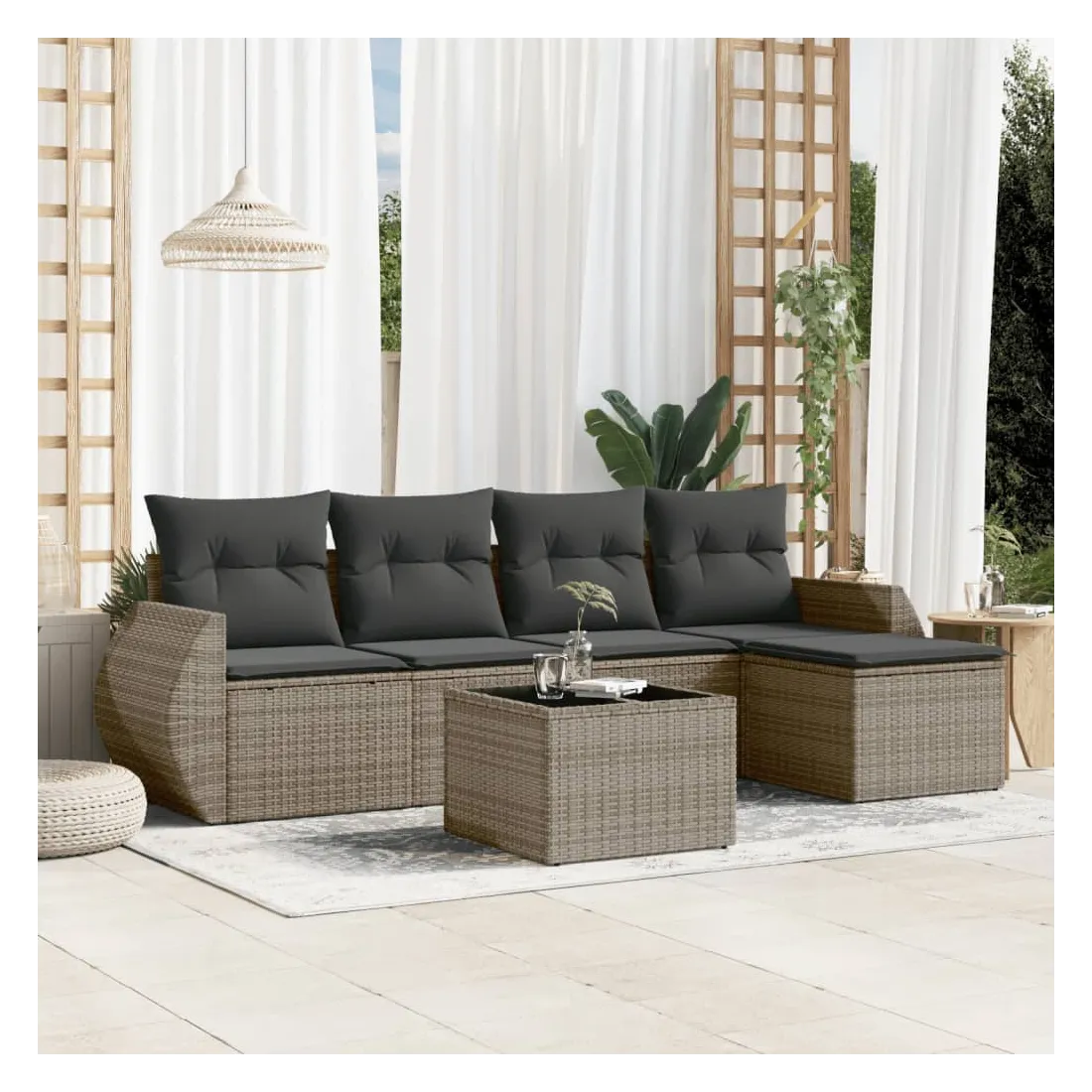 Cet ensemble de canapés de jardin est le complément parfait de votre arrière-cour, terrasse ou patio, offrant un espace confortable et accueillant pour discuter avec la famille et les amis ou simplement se détendre et profiter de l'extérieur. Matériau durable : la résine tressée, également connue sous le nom de poly rotin, est un matériau synthétique solide et nécessitant peu d'entretien qui ressemble au rotin naturel. Il est léger, facile à nettoyer et couramment utilisé pour les meubles d'extérieur en raison de sa durabilité et de ses propriétés de résistance aux intempéries.Fonction de rangement avec sac résistant à l'eau : chaque siège de jardin dispose d'un espace de rangement sous l'assise, complété par un sac résistant à l'eau pour ranger les coussins, les jouets et d'autres objets. Les sacs intérieurs sont dotés d'un couvercle et peuvent être solidement fixés aux sièges à l'aide de bandes auto-agrippantes pour plus de stabilité.Dessus en verre : le dessus de la table d'extérieur est fabriqué en verre trempé solide et durable, ce qui le rend facile à nettoyer avec un chiffon humide et ajoute une touche d'élégance à votre espace extérieur.Housse amovible et lavable : ces coussins de siège sont dotés de housses amovibles pour un lavage et un entretien faciles.Conception modulaire : cet ensemble de meubles d'extérieur a une conception modulaire, ce qui le rend complètement flexible et facile à déplacer, afin que vous puissiez créer un agencement de meubles d'extérieur personnalisé. Bon à savoir :Pour que vos meubles d'extérieur restent beaux, nous vous recommandons de les protéger avec une housse imperméable.
