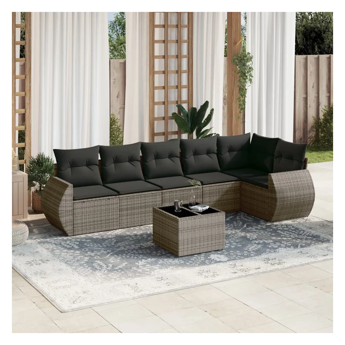 Cet ensemble de canapés de jardin est le complément parfait de votre arrière-cour, terrasse ou patio, offrant un espace confortable et accueillant pour discuter avec la famille et les amis ou simplement se détendre et profiter de l'extérieur. Matériau durable : la résine tressée, également connue sous le nom de poly rotin, est un matériau synthétique solide et nécessitant peu d'entretien qui ressemble au rotin naturel. Il est léger, facile à nettoyer et couramment utilisé pour les meubles d'extérieur en raison de sa durabilité et de ses propriétés de résistance aux intempéries.Fonction de rangement avec sac résistant à l'eau : chaque siège de jardin dispose d'un espace de rangement sous l'assise, complété par un sac résistant à l'eau pour ranger les coussins, les jouets et d'autres objets. Les sacs intérieurs sont dotés d'un couvercle et peuvent être solidement fixés aux sièges à l'aide de bandes auto-agrippantes pour plus de stabilité.Dessus en verre : le dessus de la table d'extérieur est fabriqué en verre trempé solide et durable, ce qui le rend facile à nettoyer avec un chiffon humide et ajoute une touche d'élégance à votre espace extérieur.Housse amovible et lavable : ces coussins de siège sont dotés de housses amovibles pour un lavage et un entretien faciles.Conception modulaire : cet ensemble de meubles d'extérieur a une conception modulaire, ce qui le rend complètement flexible et facile à déplacer, afin que vous puissiez créer un agencement de meubles d'extérieur personnalisé. Bon à savoir :Pour que vos meubles d'extérieur restent beaux, nous vous recommandons de les protéger avec une housse imperméable.