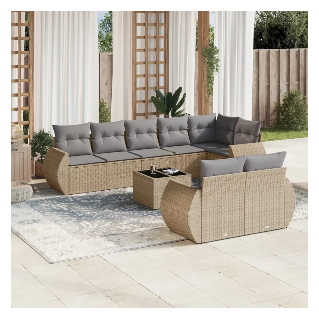 Cet ensemble de canapés de jardin est le complément parfait de votre arrière-cour, terrasse ou patio, offrant un espace confortable et accueillant pour discuter avec la famille et les amis ou simplement se détendre et profiter de l'extérieur. Matériau durable : la résine tressée, également connue sous le nom de poly rotin, est un matériau synthétique solide et nécessitant peu d'entretien qui ressemble au rotin naturel. Il est léger, facile à nettoyer et couramment utilisé pour les meubles d'extérieur en raison de sa durabilité et de ses propriétés de résistance aux intempéries.Fonction de rangement avec sac résistant à l'eau : chaque siège de jardin dispose d'un espace de rangement sous l'assise, complété par un sac résistant à l'eau pour ranger les coussins, les jouets et d'autres objets. Les sacs intérieurs sont dotés d'un couvercle et peuvent être solidement fixés aux sièges à l'aide de bandes auto-agrippantes pour plus de stabilité.Dessus en verre : le dessus de la table d'extérieur est fabriqué en verre trempé solide et durable, ce qui le rend facile à nettoyer avec un chiffon humide et ajoute une touche d'élégance à votre espace extérieur.Housse amovible et lavable : ces coussins de siège sont dotés de housses amovibles pour un lavage et un entretien faciles.Conception modulaire : cet ensemble de meubles d'extérieur a une conception modulaire, ce qui le rend complètement flexible et facile à déplacer, afin que vous puissiez créer un agencement de meubles d'extérieur personnalisé. Bon à savoir :Pour que vos meubles d'extérieur restent beaux, nous vous recommandons de les protéger avec une housse imperméable.