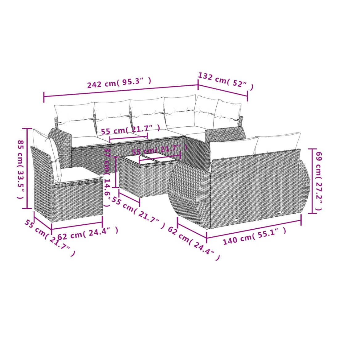 - Dimensions du coussin de dossier : 55 x 45 x 13 cm (L x l x é)