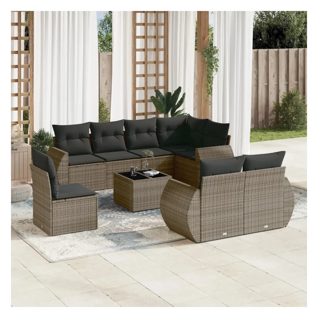 Cet ensemble de canapés de jardin est le complément parfait de votre arrière-cour, terrasse ou patio, offrant un espace confortable et accueillant pour discuter avec la famille et les amis ou simplement se détendre et profiter de l'extérieur. Matériau durable : la résine tressée, également connue sous le nom de poly rotin, est un matériau synthétique solide et nécessitant peu d'entretien qui ressemble au rotin naturel. Il est léger, facile à nettoyer et couramment utilisé pour les meubles d'extérieur en raison de sa durabilité et de ses propriétés de résistance aux intempéries.Fonction de rangement avec sac résistant à l'eau : chaque siège de jardin dispose d'un espace de rangement sous l'assise, complété par un sac résistant à l'eau pour ranger les coussins, les jouets et d'autres objets. Les sacs intérieurs sont dotés d'un couvercle et peuvent être solidement fixés aux sièges à l'aide de bandes auto-agrippantes pour plus de stabilité.Dessus en verre : le dessus de la table d'extérieur est fabriqué en verre trempé solide et durable, ce qui le rend facile à nettoyer avec un chiffon humide et ajoute une touche d'élégance à votre espace extérieur.Housse amovible et lavable : ces coussins de siège sont dotés de housses amovibles pour un lavage et un entretien faciles.Conception modulaire : cet ensemble de meubles d'extérieur a une conception modulaire, ce qui le rend complètement flexible et facile à déplacer, afin que vous puissiez créer un agencement de meubles d'extérieur personnalisé. Bon à savoir :Pour que vos meubles d'extérieur restent beaux, nous vous recommandons de les protéger avec une housse imperméable.
