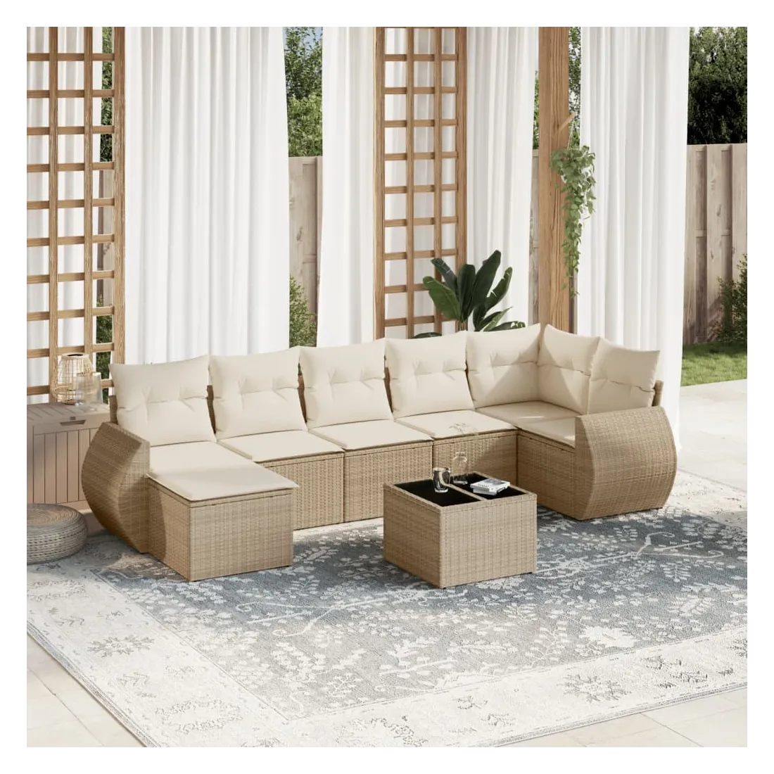 Cet ensemble de canapés de jardin est le complément parfait de votre arrière-cour, terrasse ou patio, offrant un espace confortable et accueillant pour discuter avec la famille et les amis ou simplement se détendre et profiter de l'extérieur. Matériau durable : la résine tressée, également connue sous le nom de poly rotin, est un matériau synthétique solide et nécessitant peu d'entretien qui ressemble au rotin naturel. Il est léger, facile à nettoyer et couramment utilisé pour les meubles d'extérieur en raison de sa durabilité et de ses propriétés de résistance aux intempéries.Fonction de rangement avec sac résistant à l'eau : chaque siège de jardin dispose d'un espace de rangement sous l'assise, complété par un sac résistant à l'eau pour ranger les coussins, les jouets et d'autres objets. Les sacs intérieurs sont dotés d'un couvercle et peuvent être solidement fixés aux sièges à l'aide de bandes auto-agrippantes pour plus de stabilité.Dessus en verre : le dessus de la table d'extérieur est fabriqué en verre trempé solide et durable, ce qui le rend facile à nettoyer avec un chiffon humide et ajoute une touche d'élégance à votre espace extérieur.Housse amovible et lavable : ces coussins de siège sont dotés de housses amovibles pour un lavage et un entretien faciles.Conception modulaire : cet ensemble de meubles d'extérieur a une conception modulaire, ce qui le rend complètement flexible et facile à déplacer, afin que vous puissiez créer un agencement de meubles d'extérieur personnalisé. Bon à savoir :Pour que vos meubles d'extérieur restent beaux, nous vous recommandons de les protéger avec une housse imperméable.