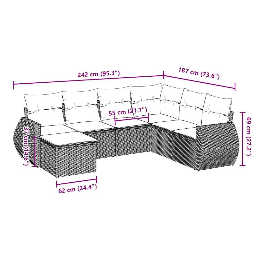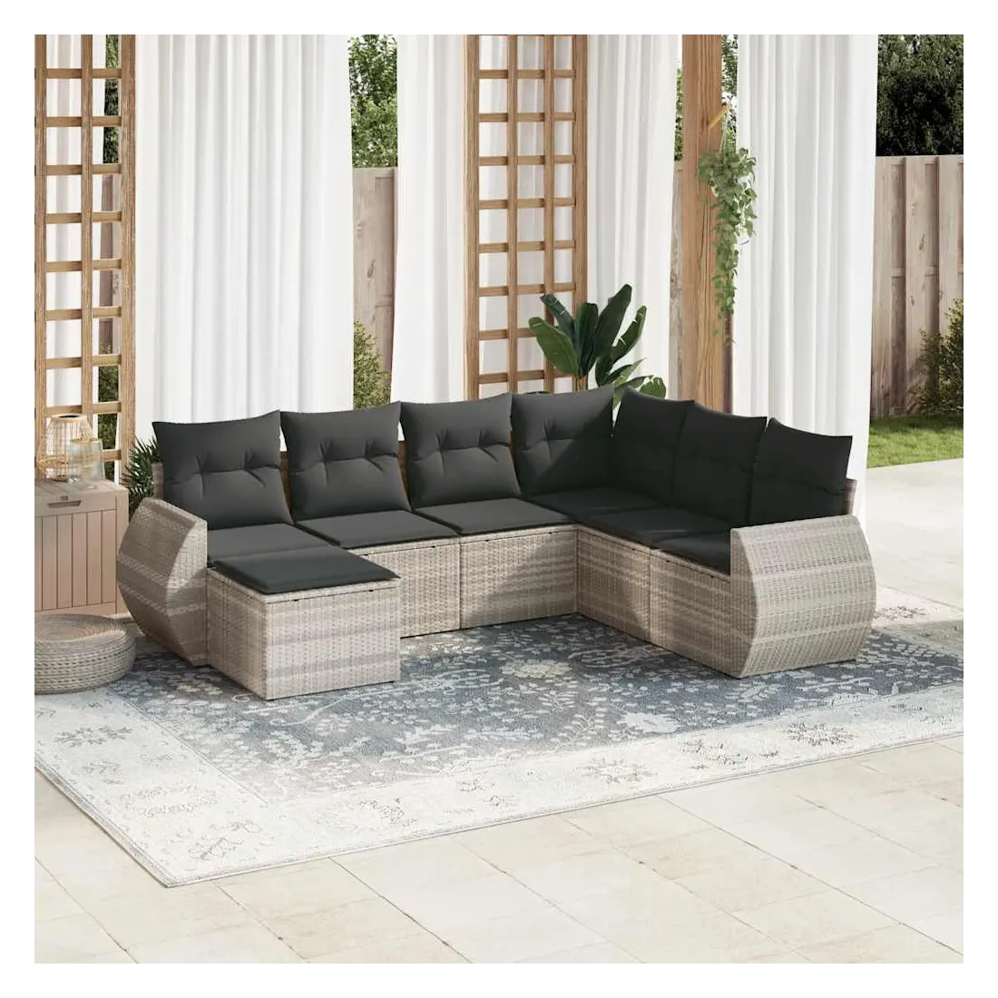 Cet ensemble de canapés de jardin est le complément parfait de votre arrière-cour, terrasse ou patio, offrant un espace confortable et accueillant pour discuter avec la famille et les amis ou simplement se détendre et profiter de l'extérieur. Matériau durable : la résine tressée, également connue sous le nom de poly rotin, est un matériau synthétique solide et nécessitant peu d'entretien qui ressemble au rotin naturel. Il est léger, facile à nettoyer et couramment utilisé pour les meubles d'extérieur en raison de sa durabilité et de ses propriétés de résistance aux intempéries.Fonction de rangement avec sac résistant à l'eau : chaque siège de jardin dispose d'un espace de rangement sous l'assise, complété par un sac résistant à l'eau pour ranger les coussins, les jouets et d'autres objets. Les sacs intérieurs sont dotés d'un couvercle et peuvent être solidement fixés aux sièges à l'aide de bandes auto-agrippantes pour plus de stabilité.Housse amovible et lavable : ces coussins de siège sont dotés de housses amovibles pour un lavage et un entretien faciles.Conception modulaire : cet ensemble de meubles d'extérieur a une conception modulaire, ce qui le rend complètement flexible et facile à déplacer, afin que vous puissiez créer un agencement de meubles d'extérieur personnalisé. Bon à savoir :Pour que vos meubles d'extérieur restent beaux, nous vous recommandons de les protéger avec une housse imperméable.
